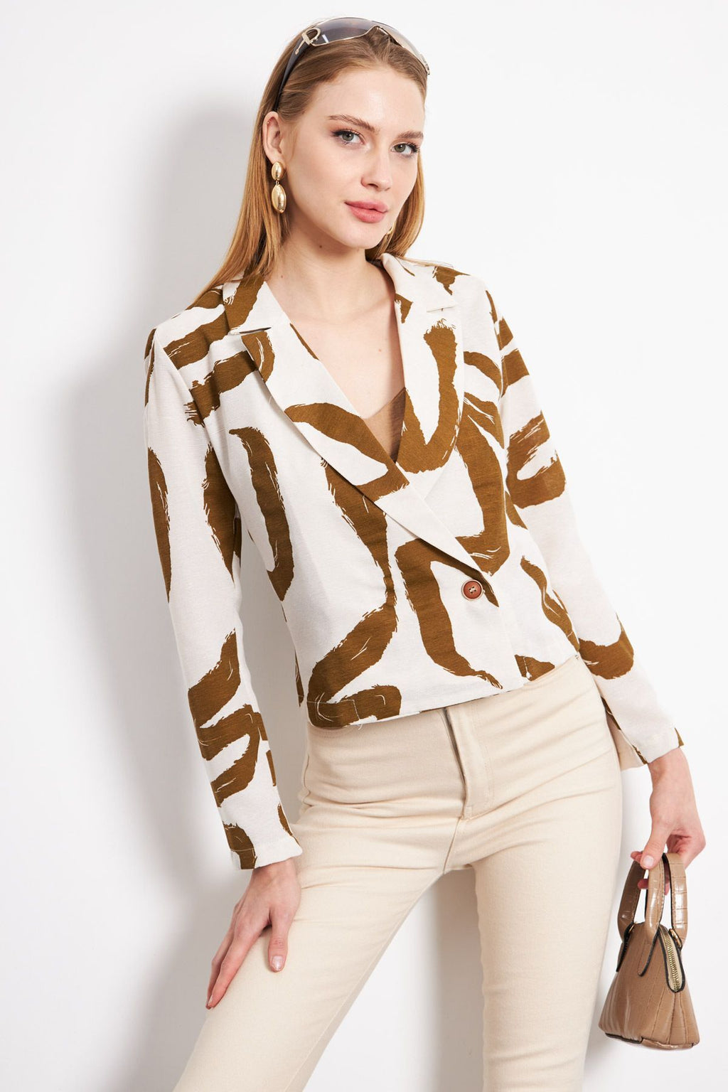 Women's Dark Khaki Double Breasted Collar Patterned Crop Jacket ARM-24Y001058