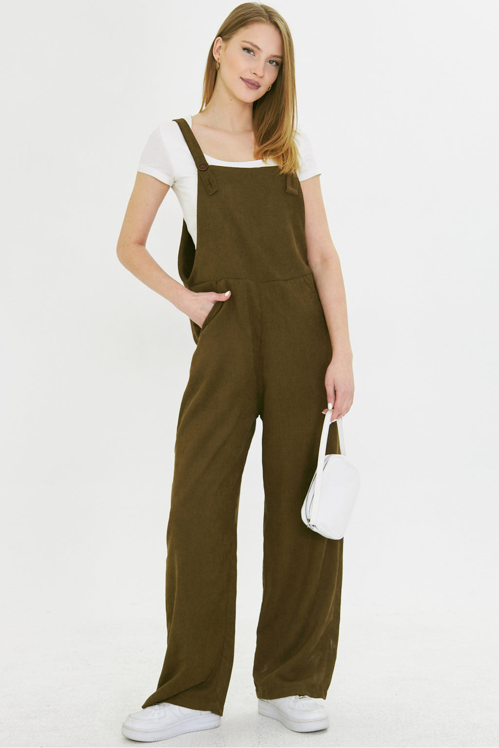 Women's Dark Khaki Velvet Pocketed Wide Leg Slim Ribbed Gardener Overalls ARM-25K001036