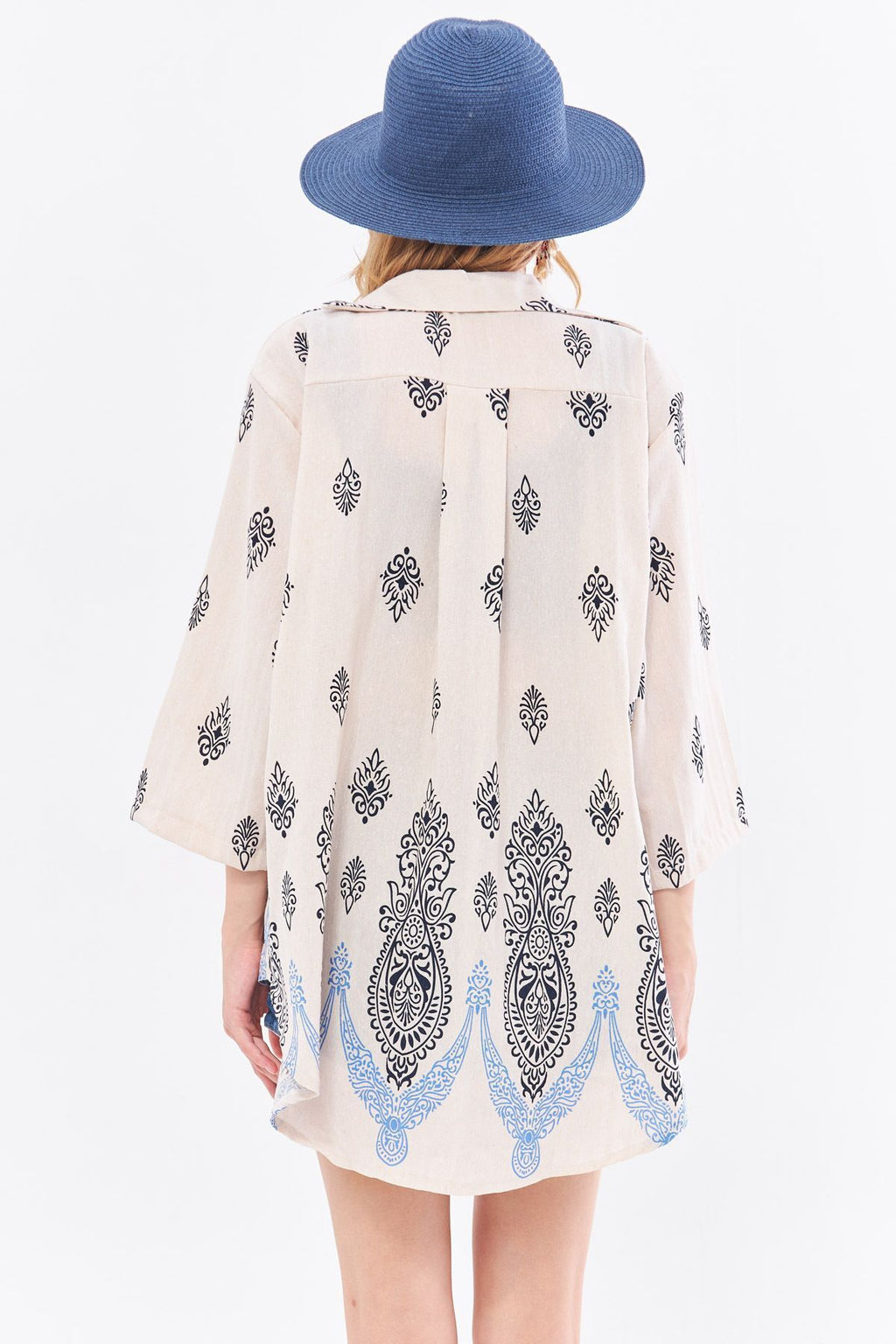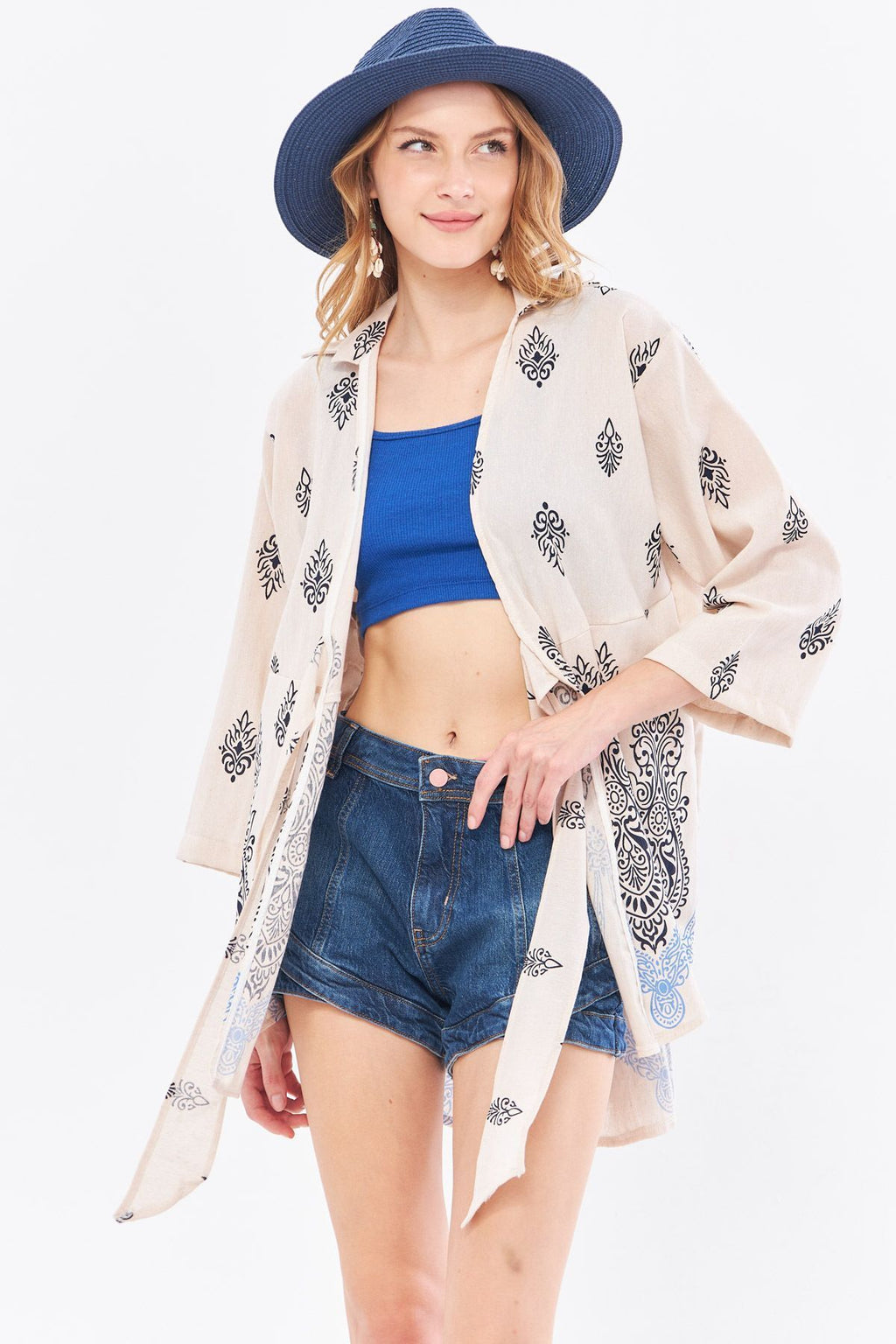 Women's dark navy blue patterned linen-looking skirt with juicy front kimono shirt ARM-24Y001092