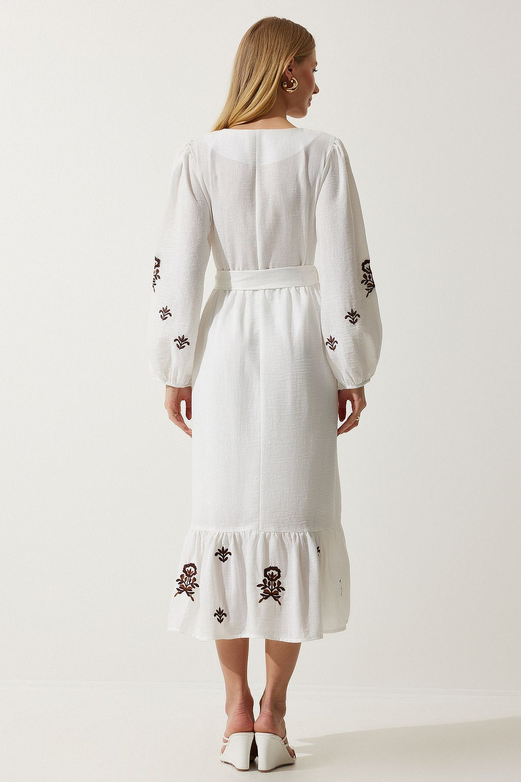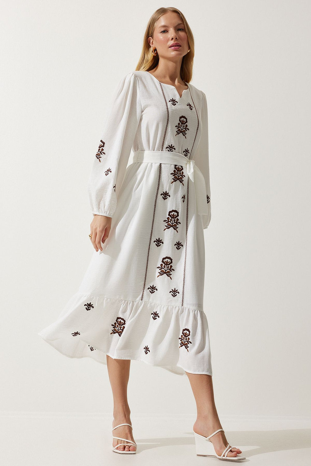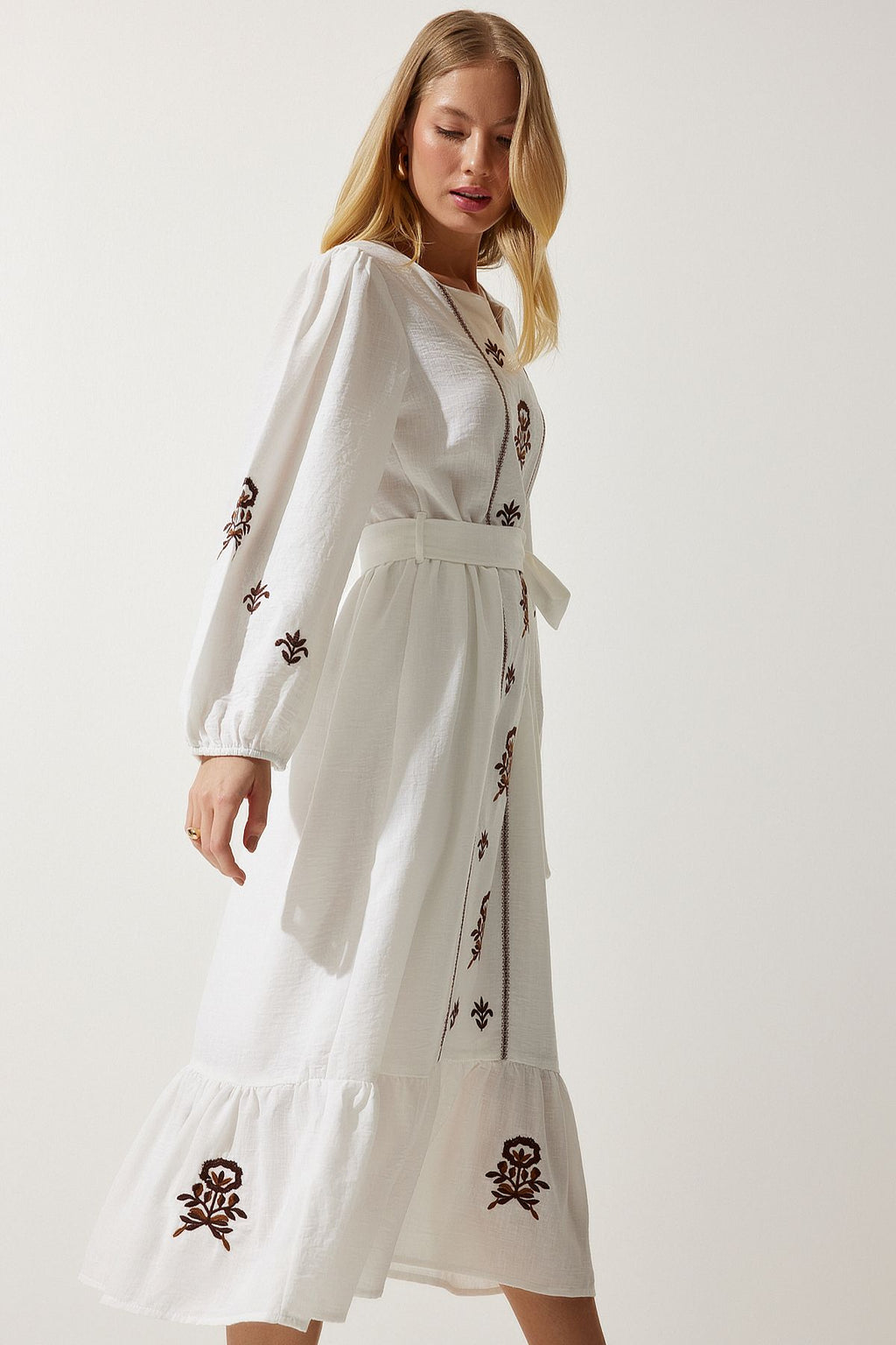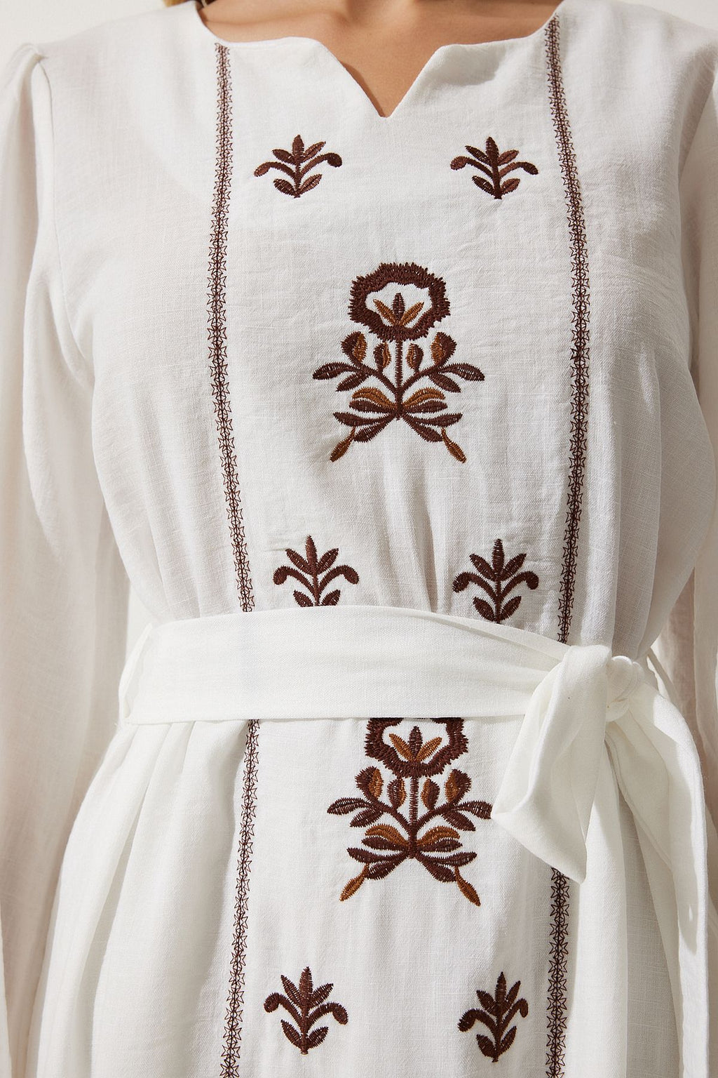 Women's Ecru Embroidery Linen Surface Long Woven Dress RG00017