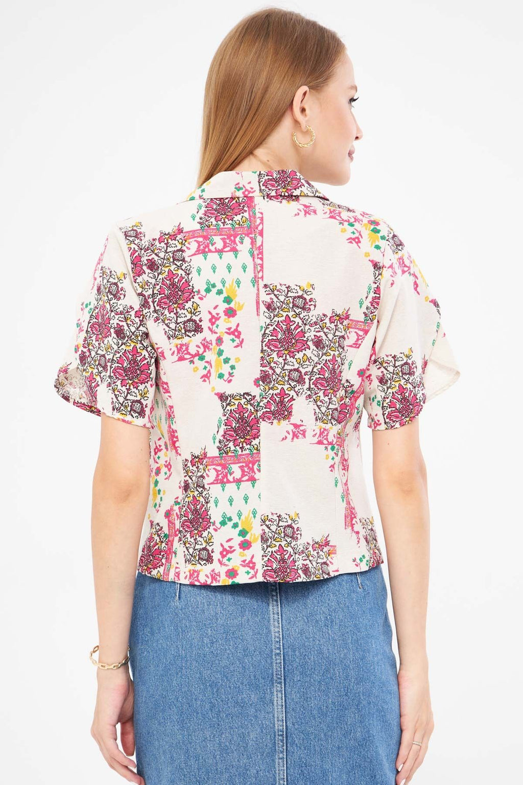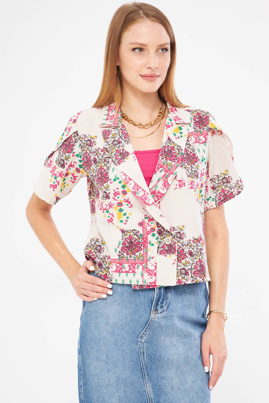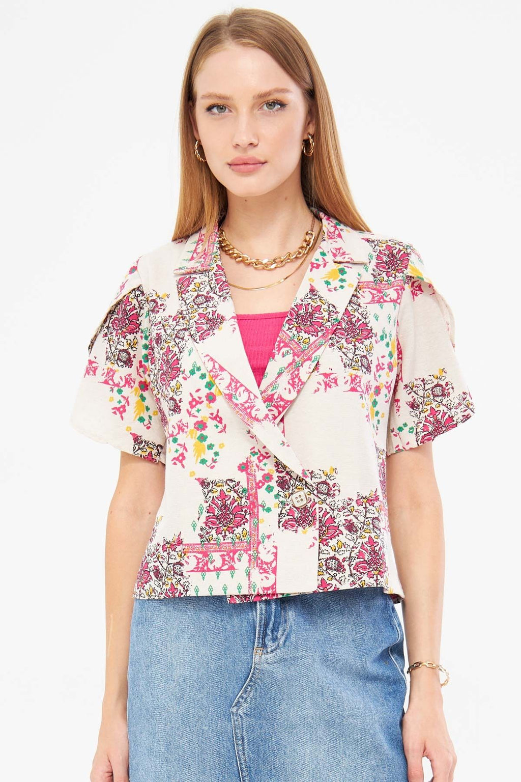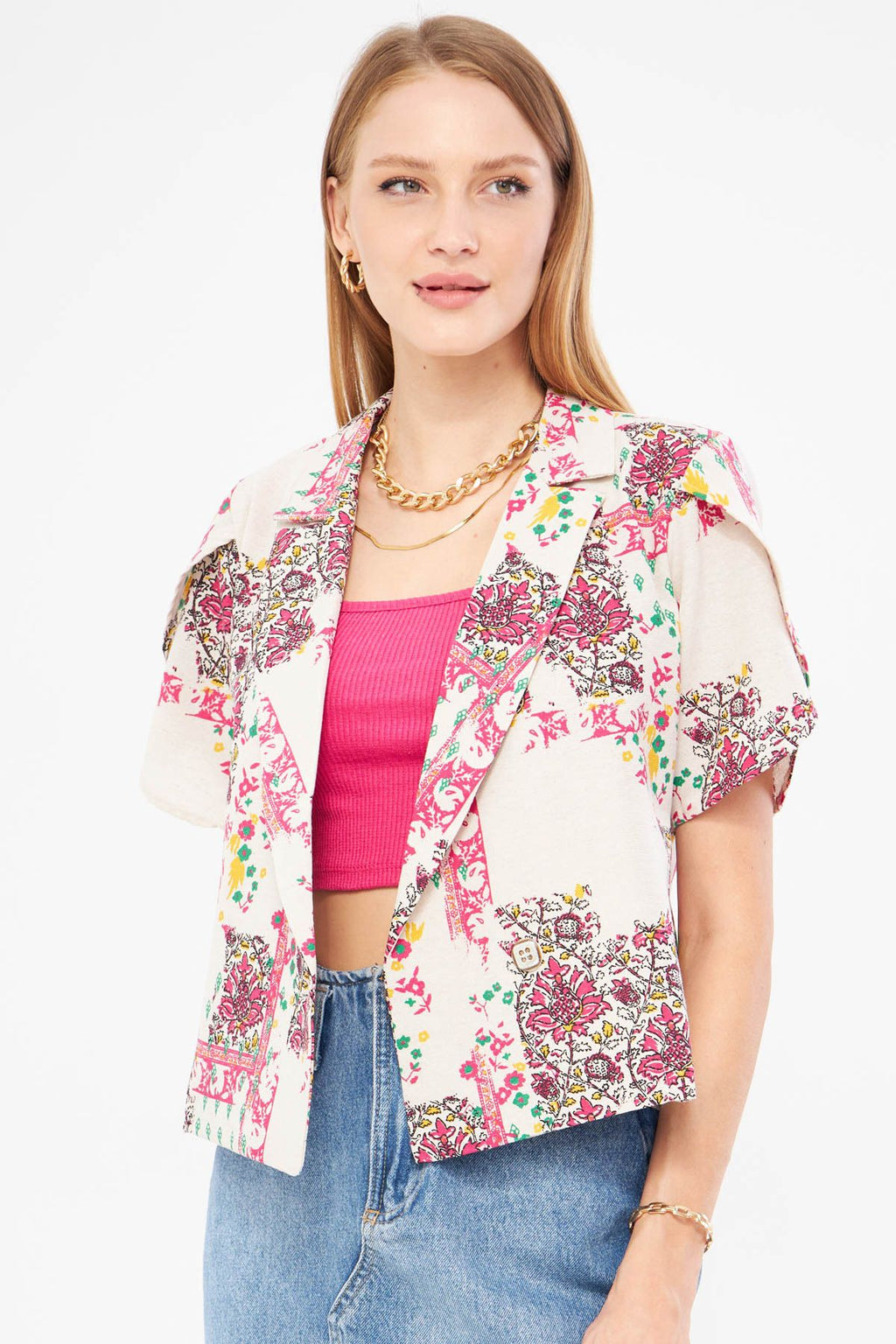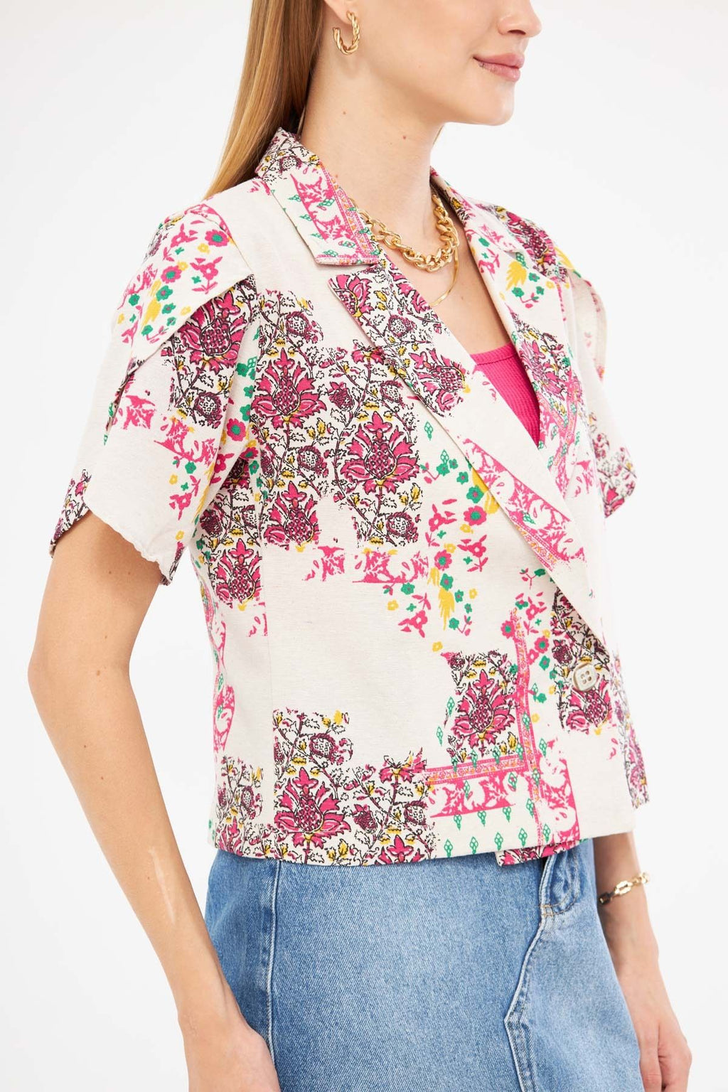 Women's Fuchsia-Green Linen-Looking Patterned Lever Slit Crop Short Sleeve Jacket ARM-24Y001095