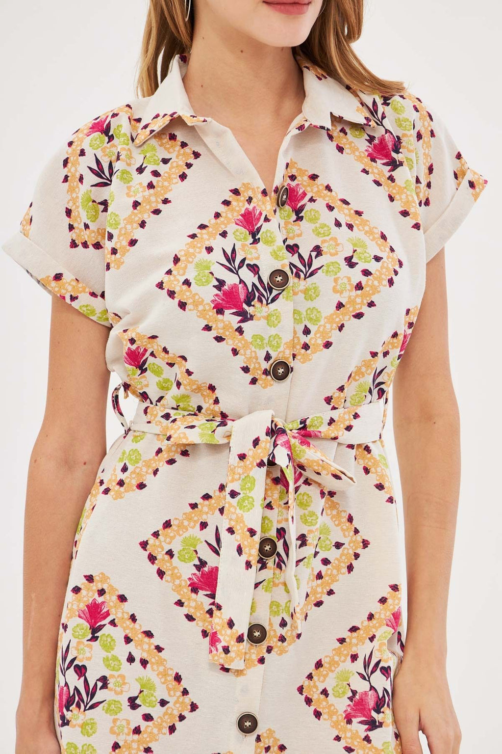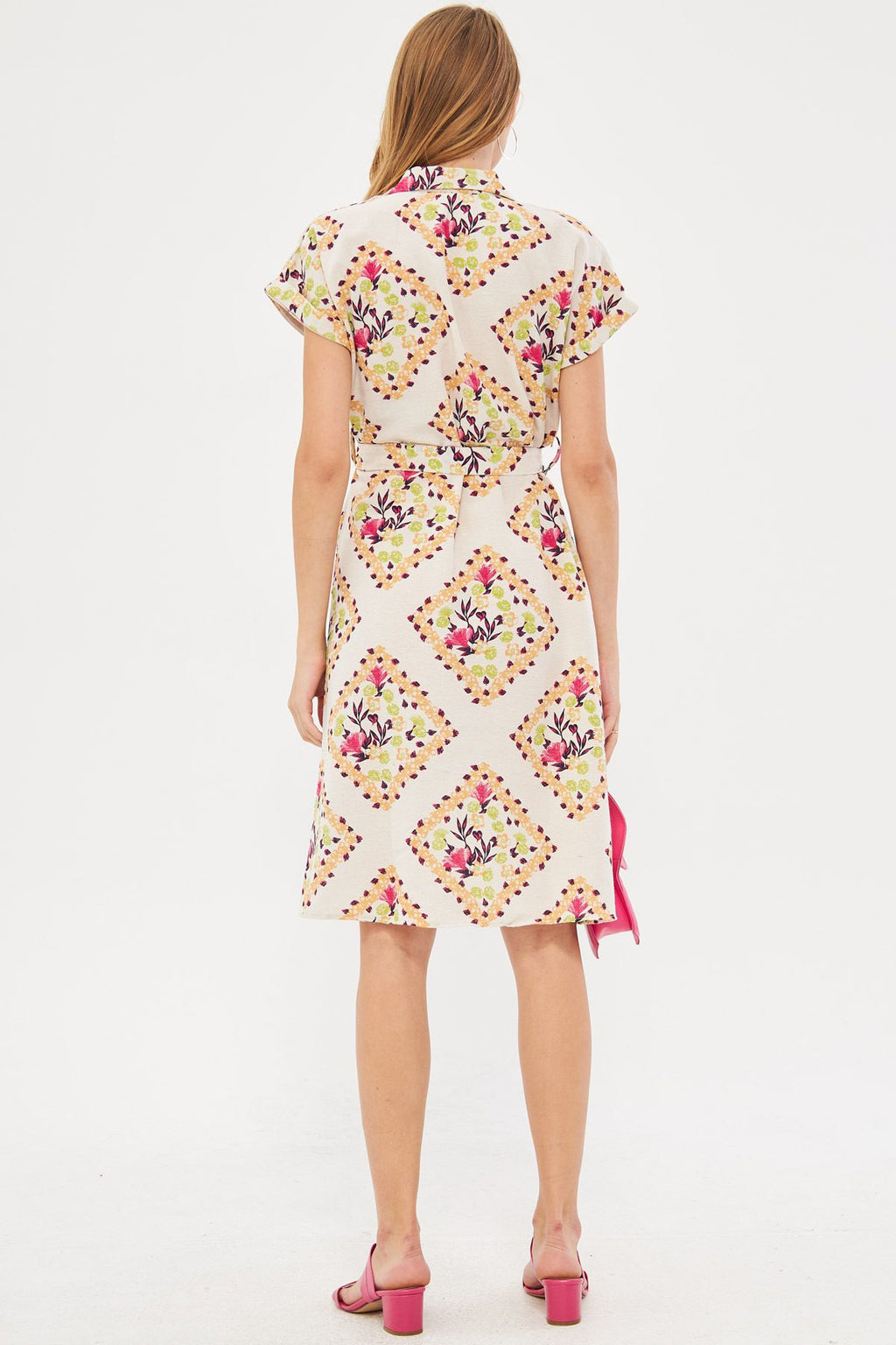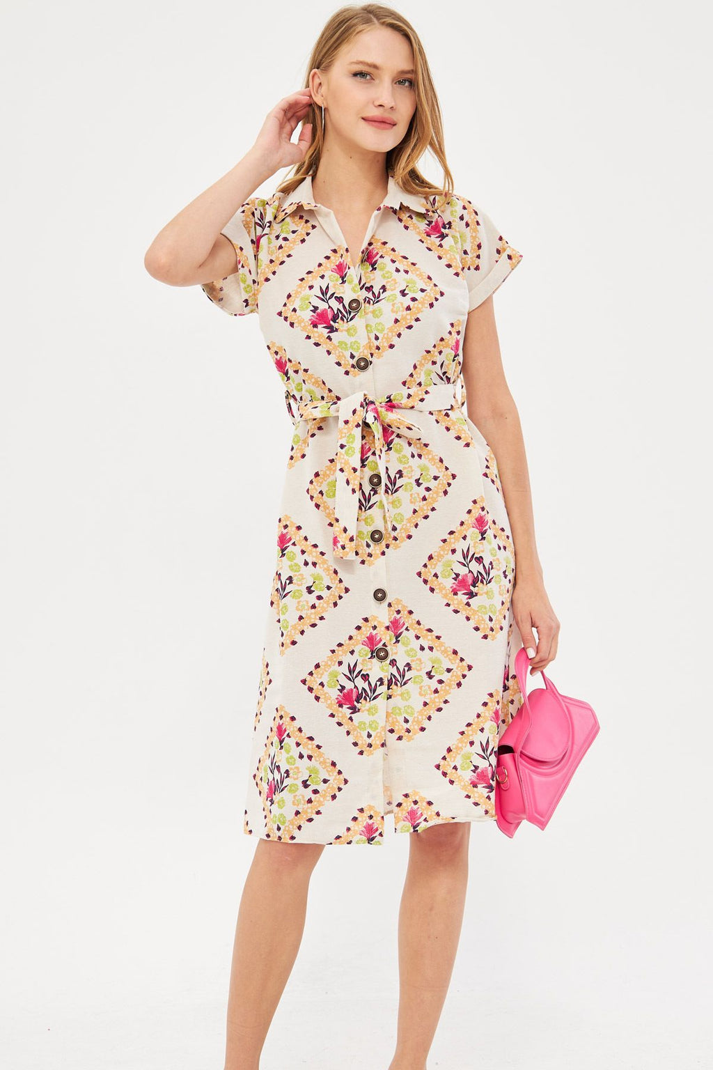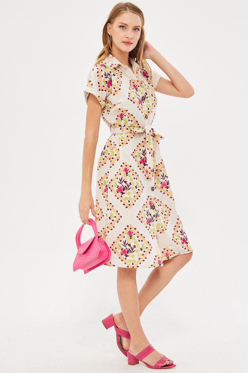 Women's Fuchsia Patterned Linen-looking waist belt short sleeve shirt dress ARM-24Y001108