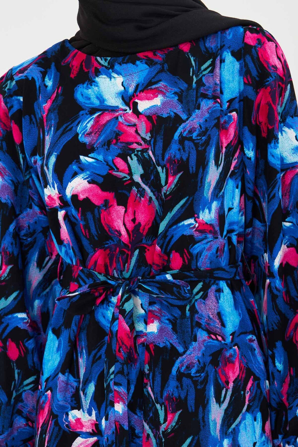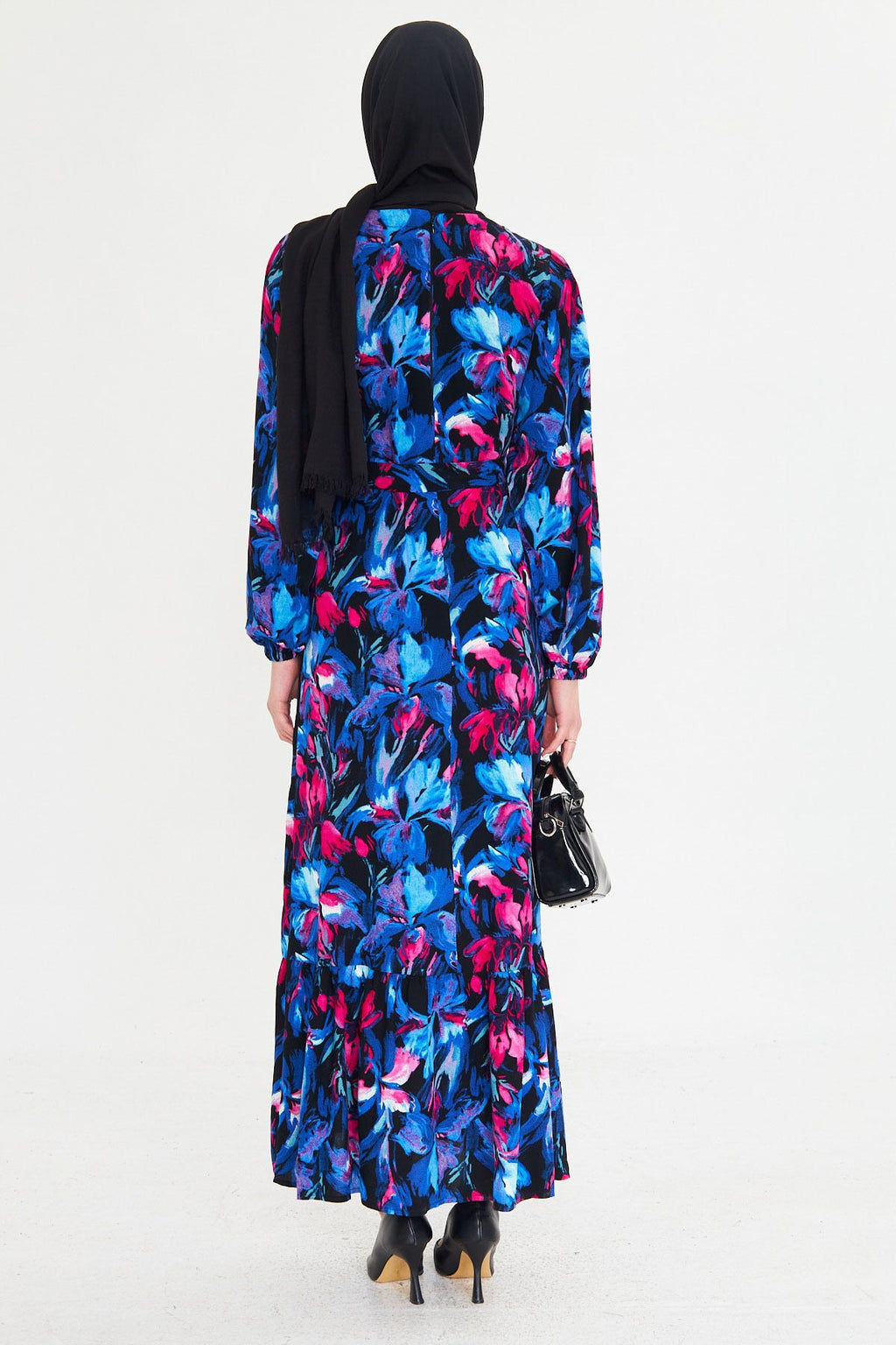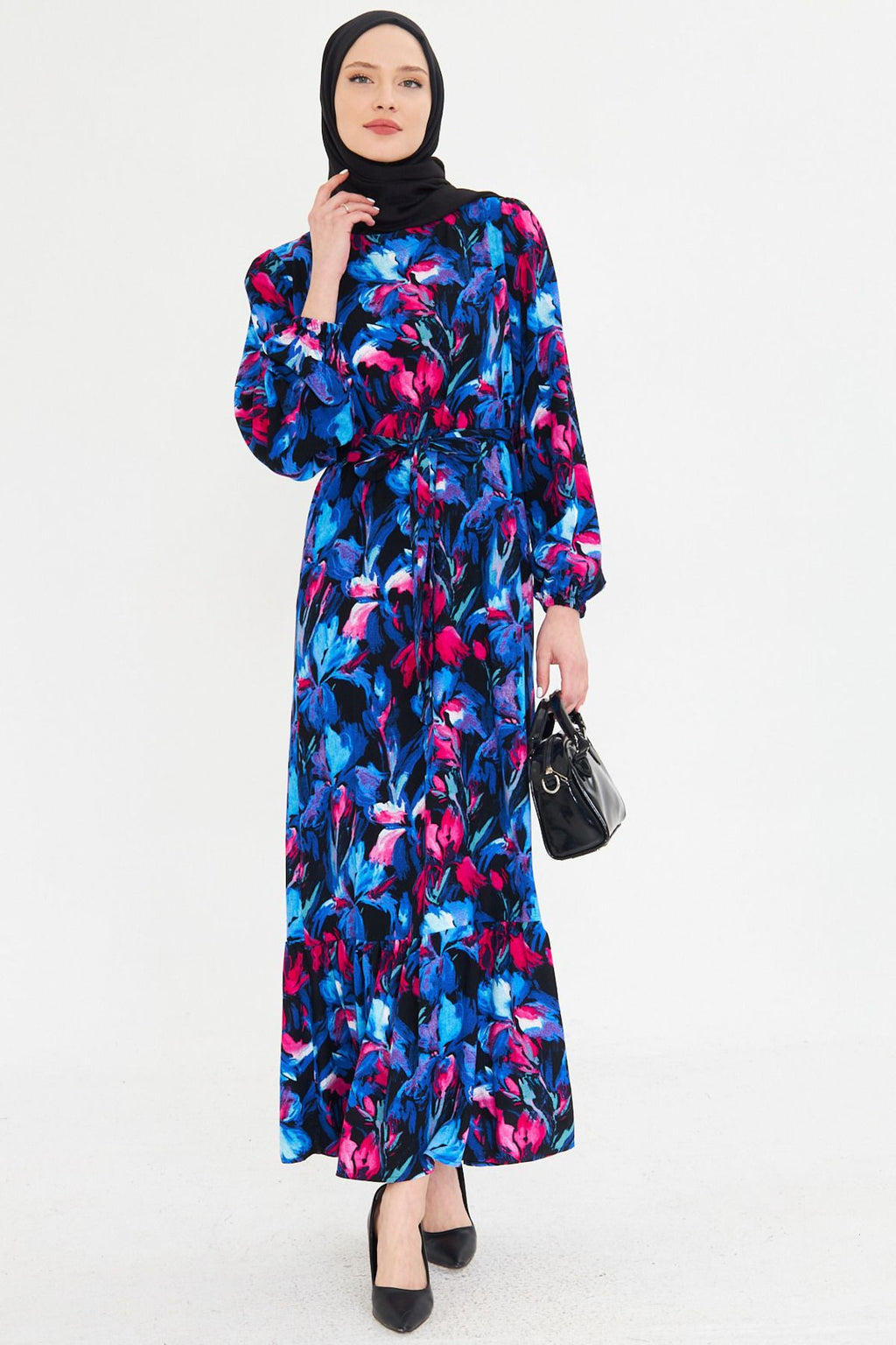 Women's Fuchsia zero collar behind the zipper skirt end with frilly belt long hijab dress ARM-25K001101