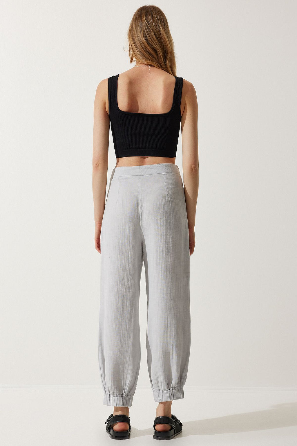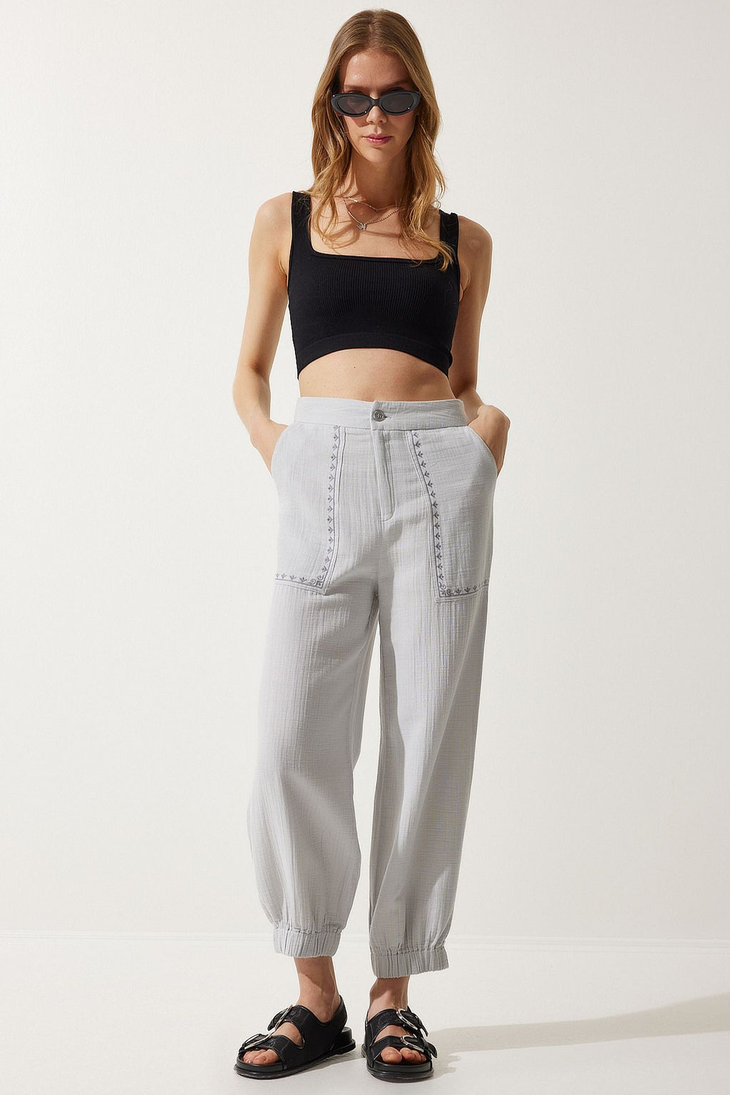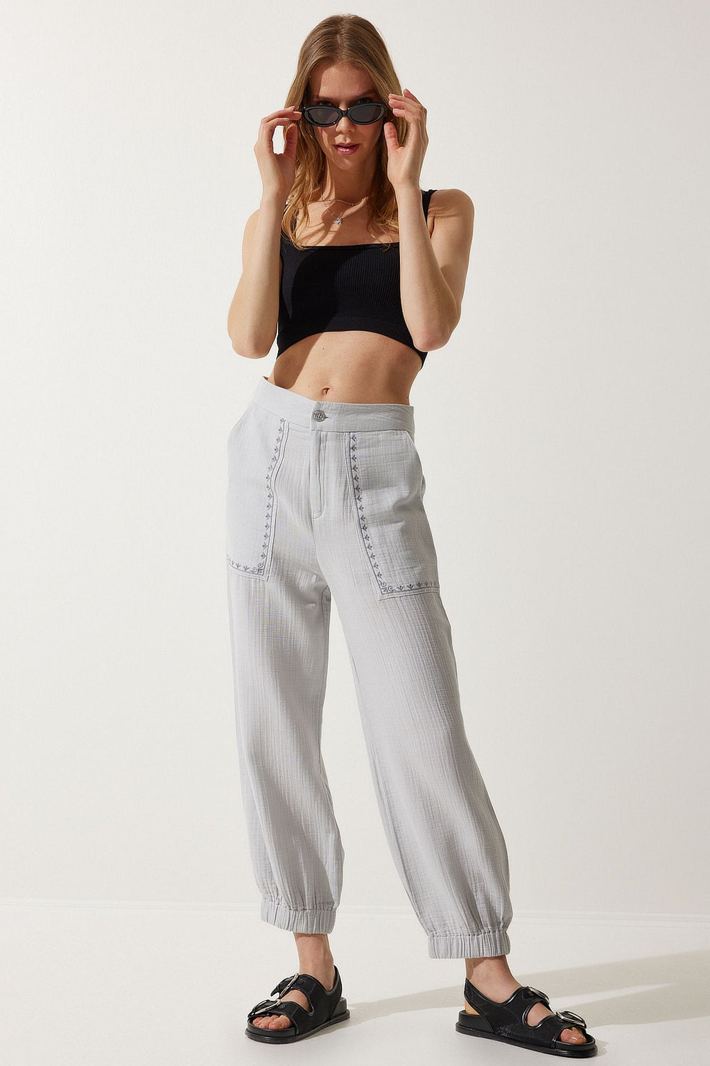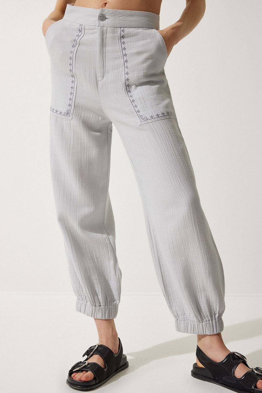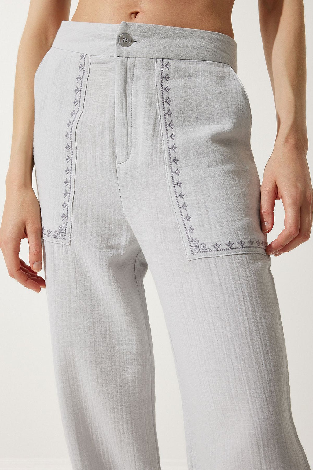 Women's Gray Embroidery Detailed Müslin Pants SF00019