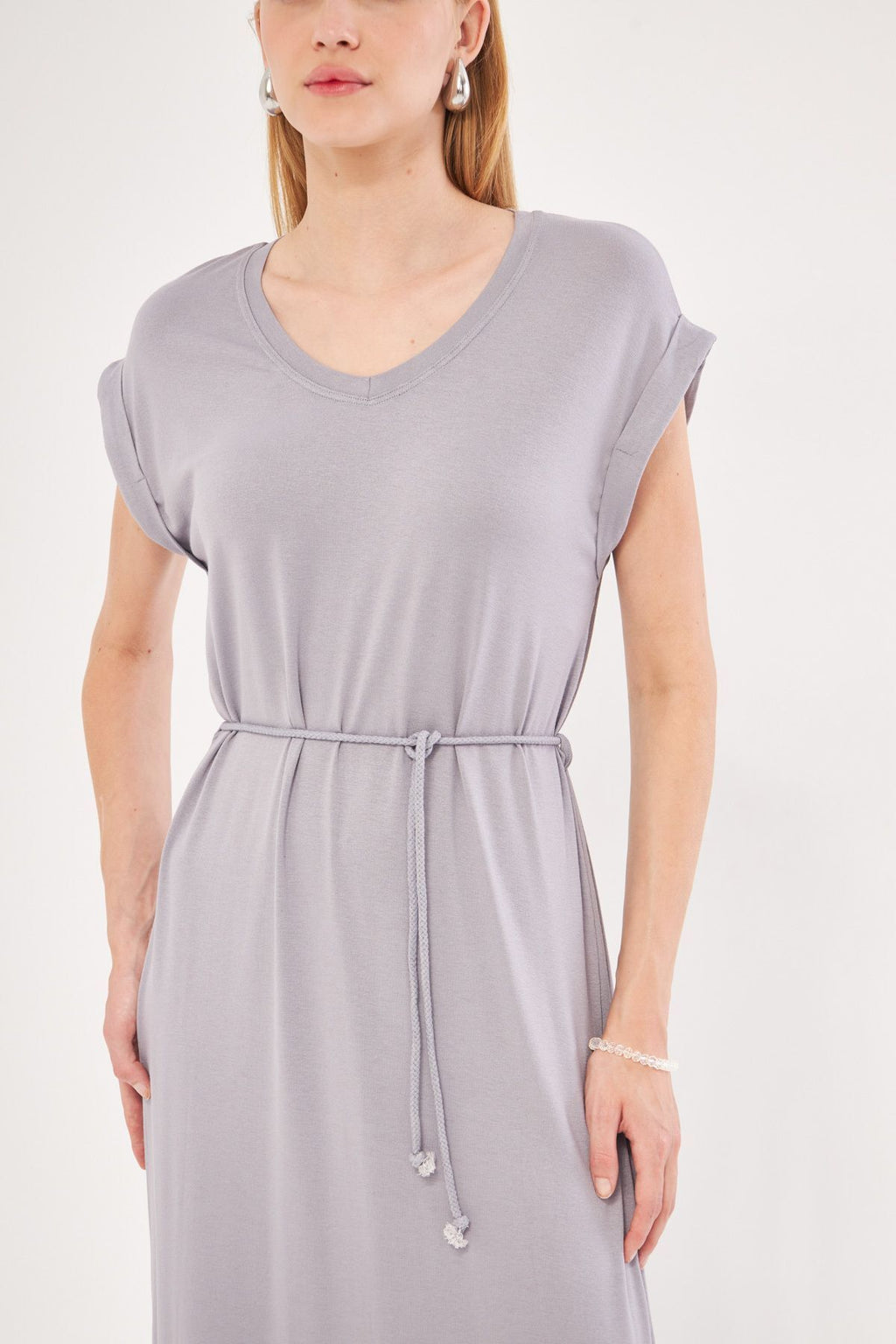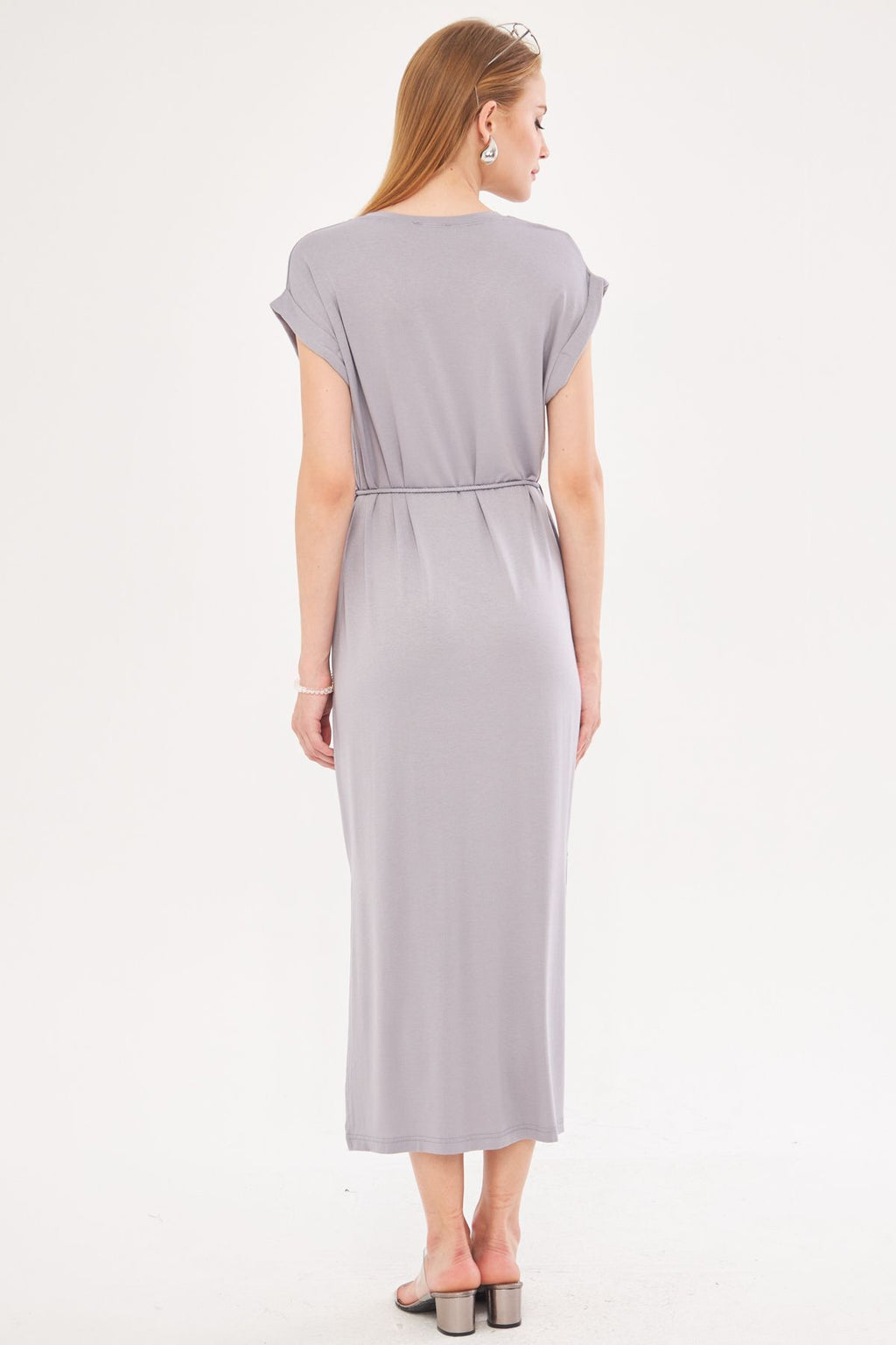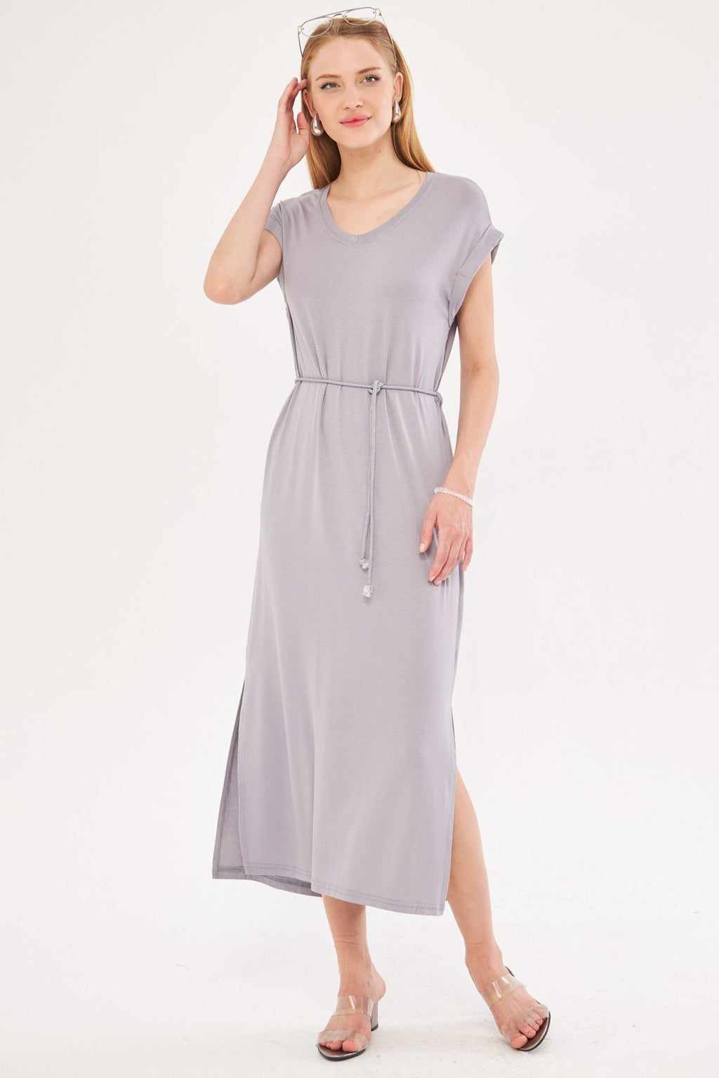 Women's gray v-neck waist belt sides with slits long dress ARM-24Y024016
