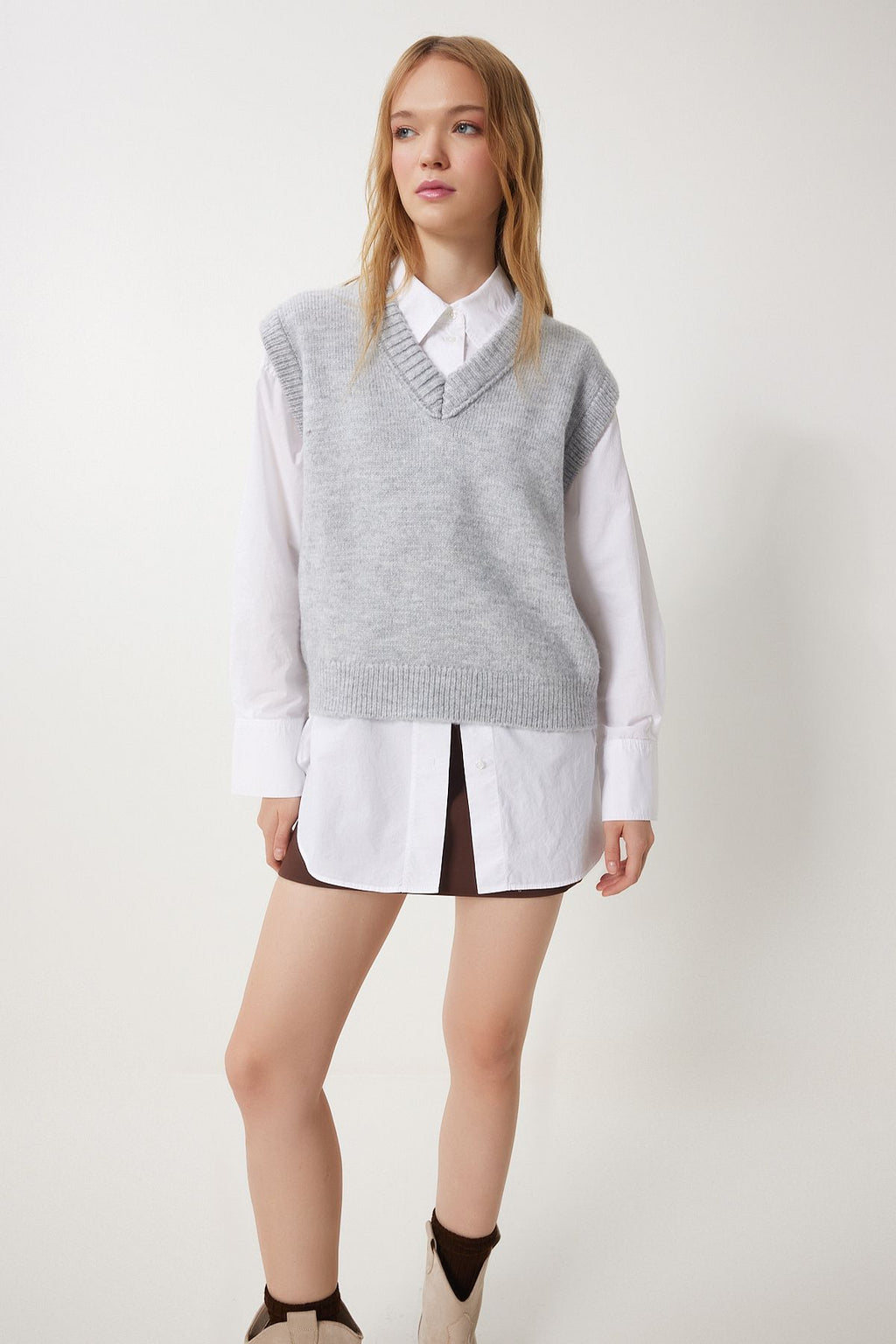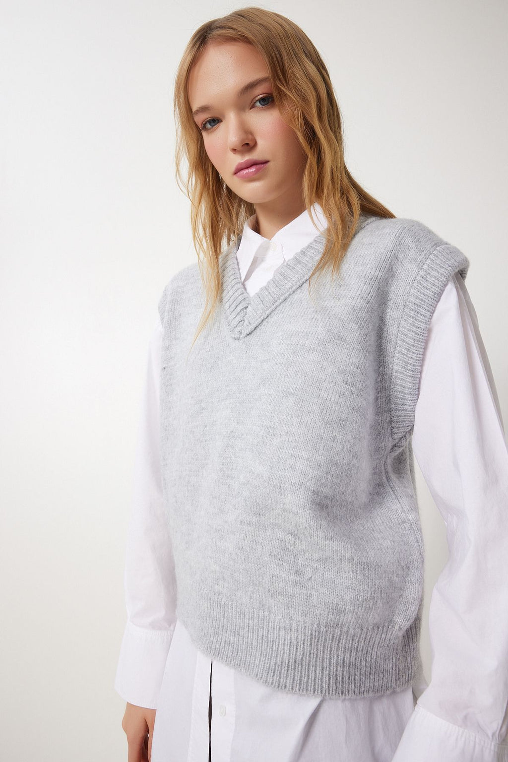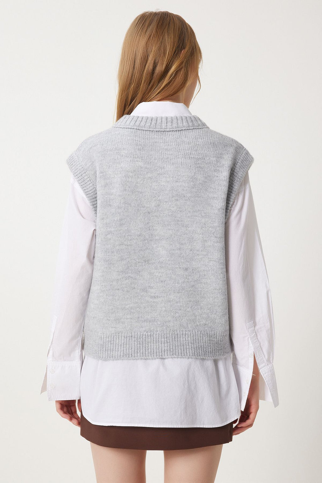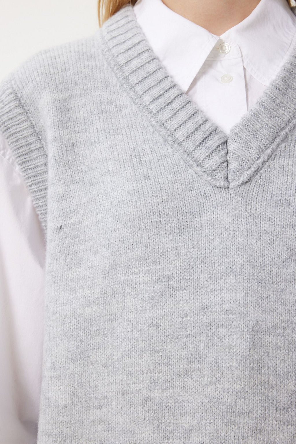Women's Gray V -Yaka Knitwear Süveter PF00099