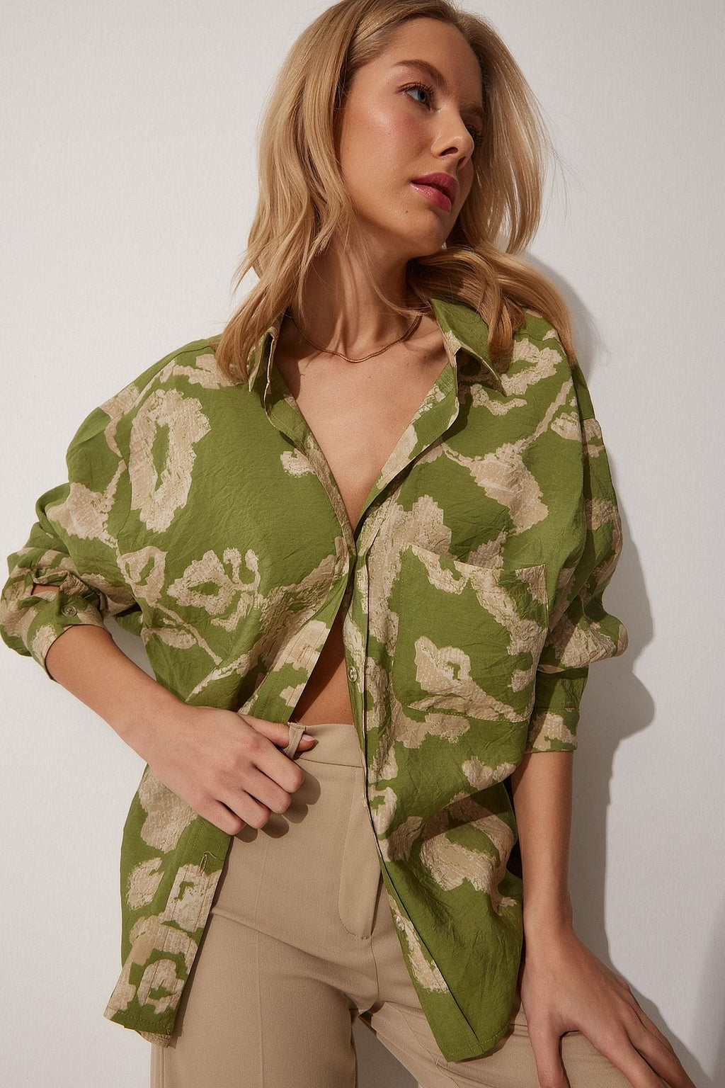 WOMEN'S GREEN PATTERNED OVERSESSES COTTION SATIN SHIRT OH00044