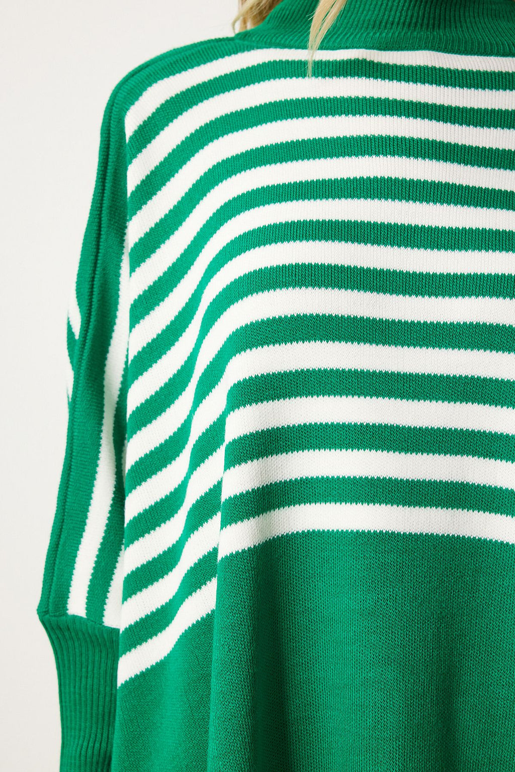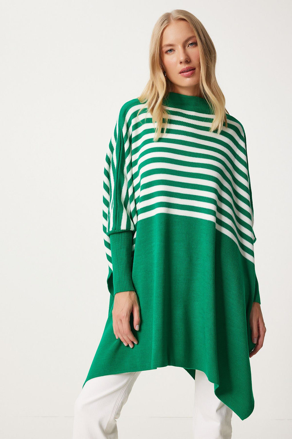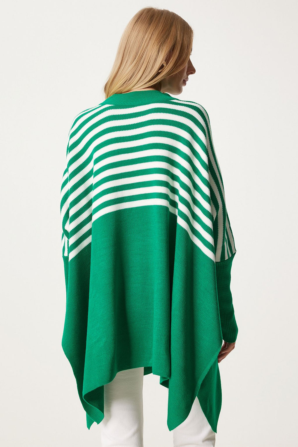 Women's Green Striped Side Slit Oversiz Pancho Sweater DD01336