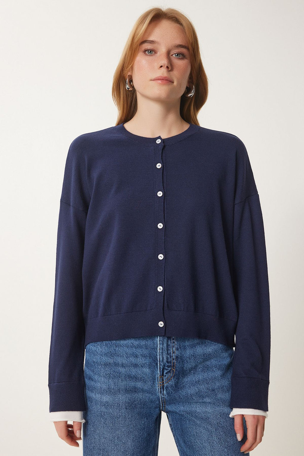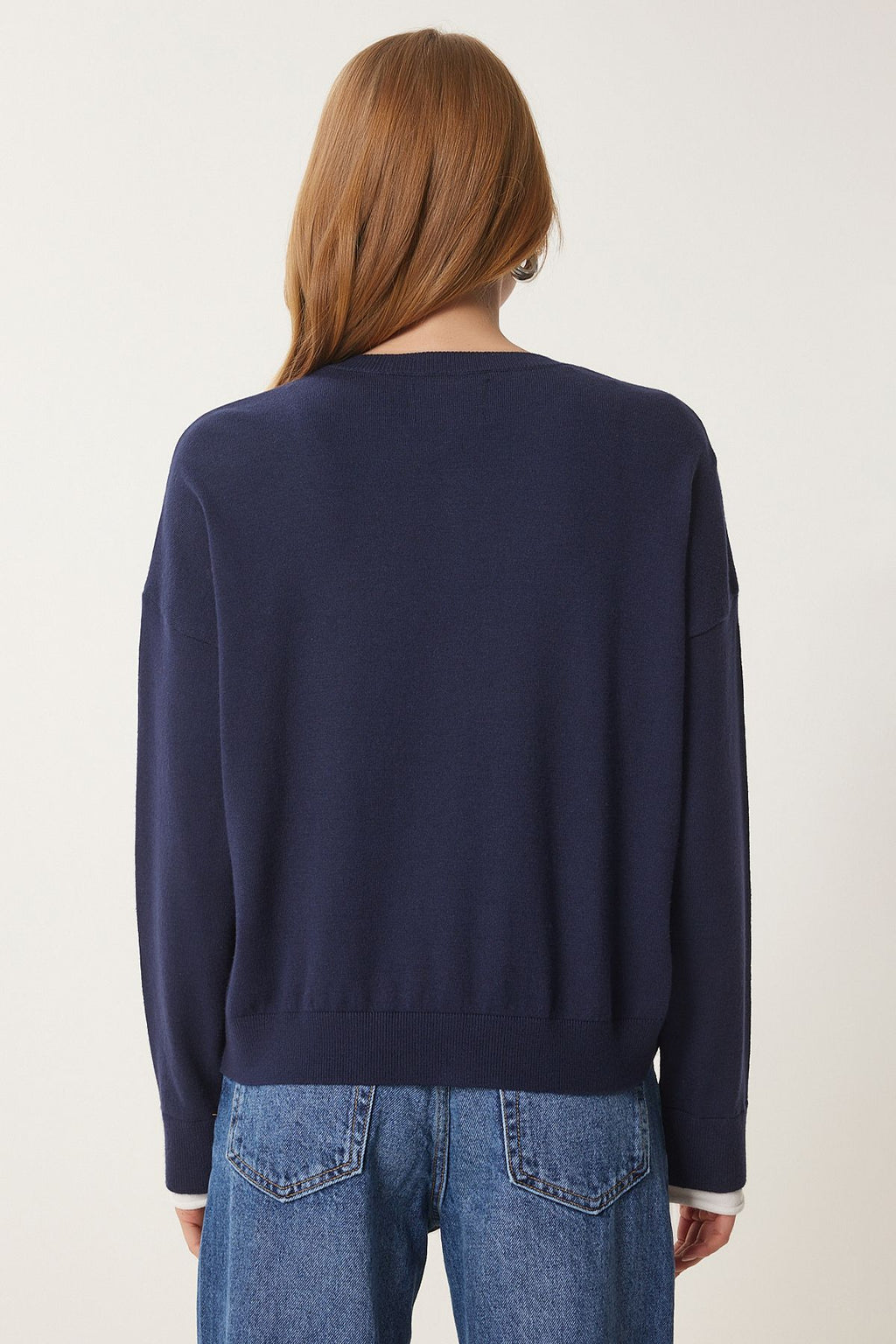Women's Navy Blue Contrast Ribbon Detail Triko Cardigo US00953