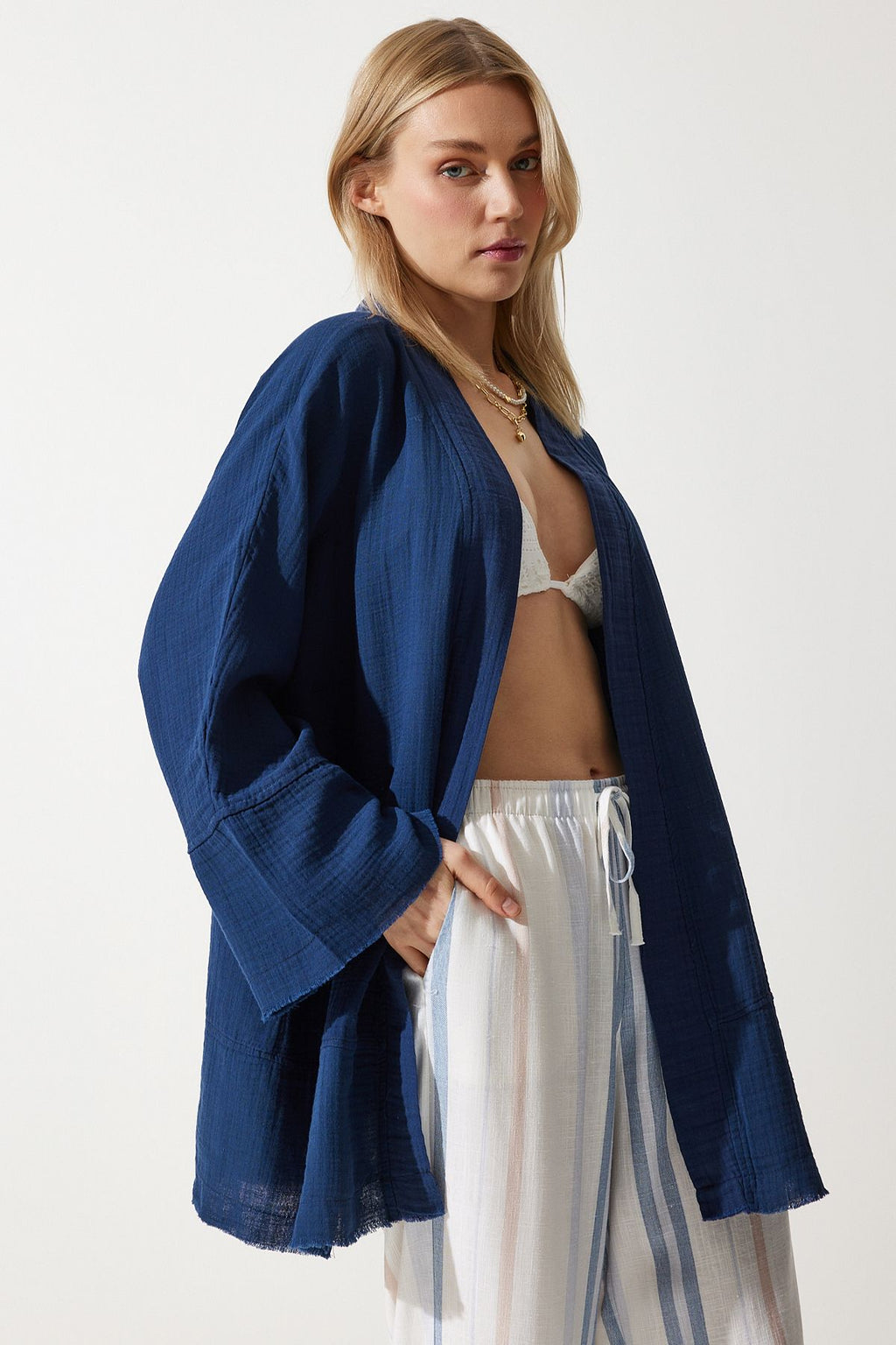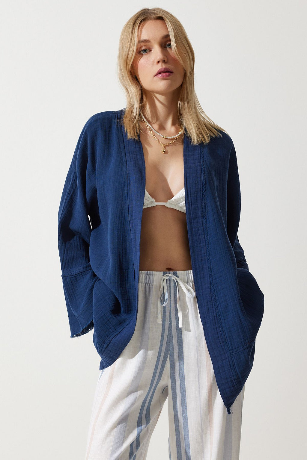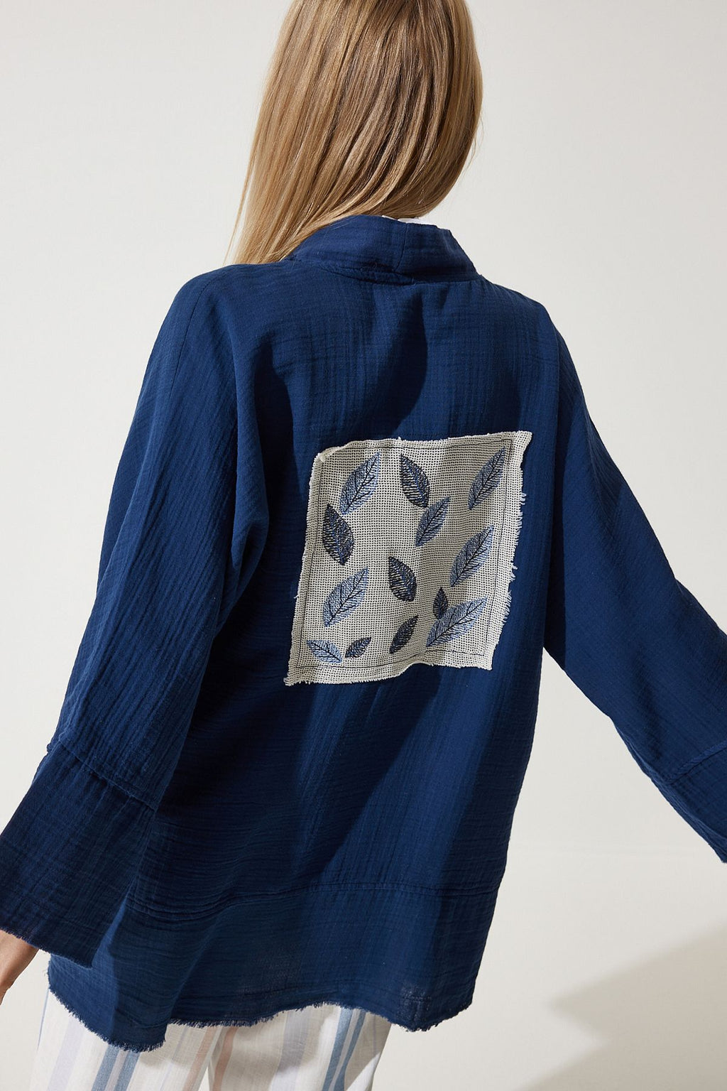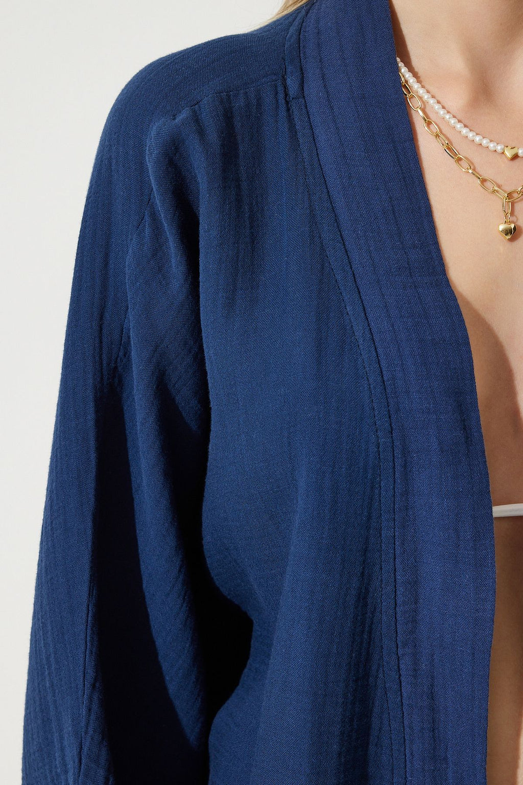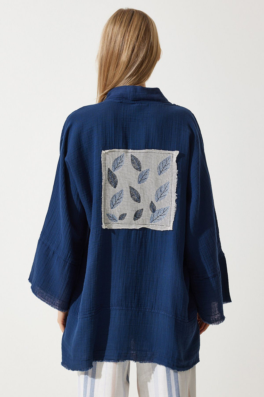 Women's Navy Blue Flower Detail Premium Muslin Kimono RG00030