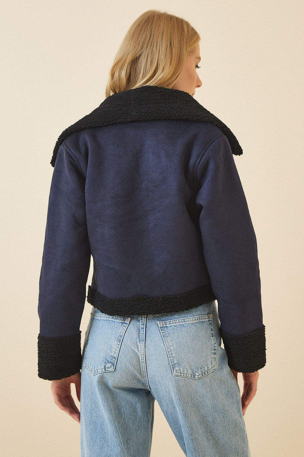 Women's Navy Plush Fur detailed artificial leather biker coat BJ00016