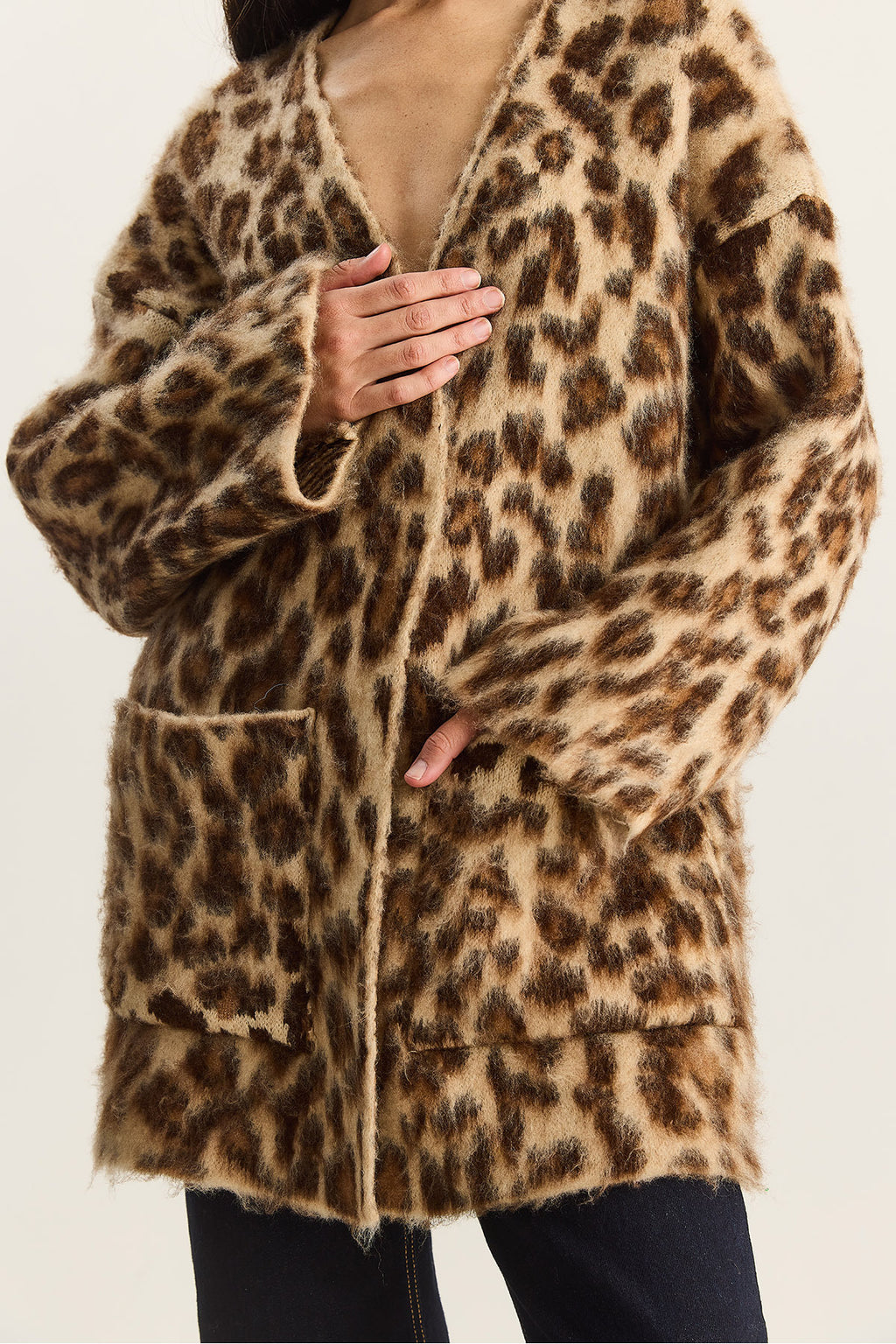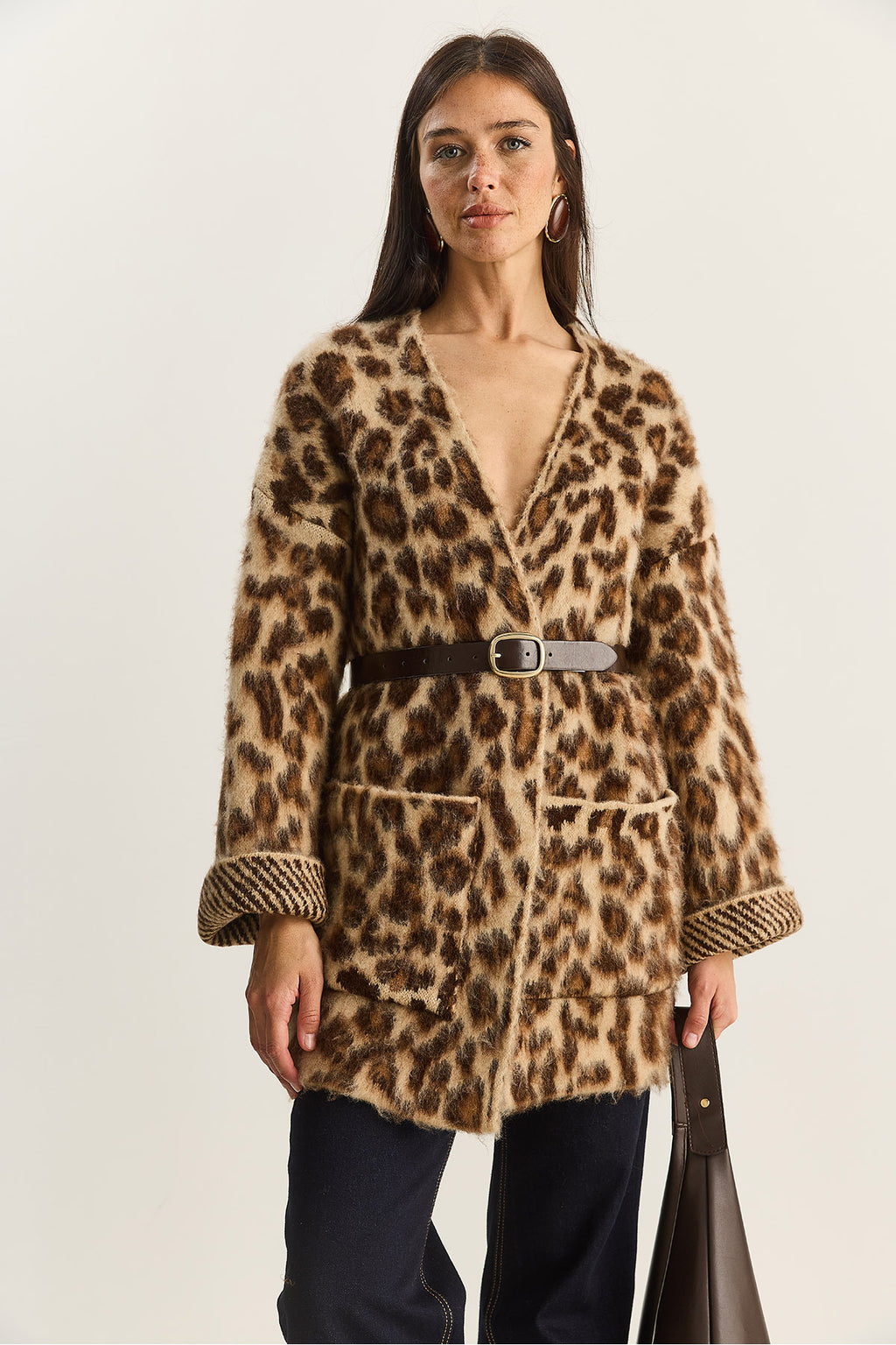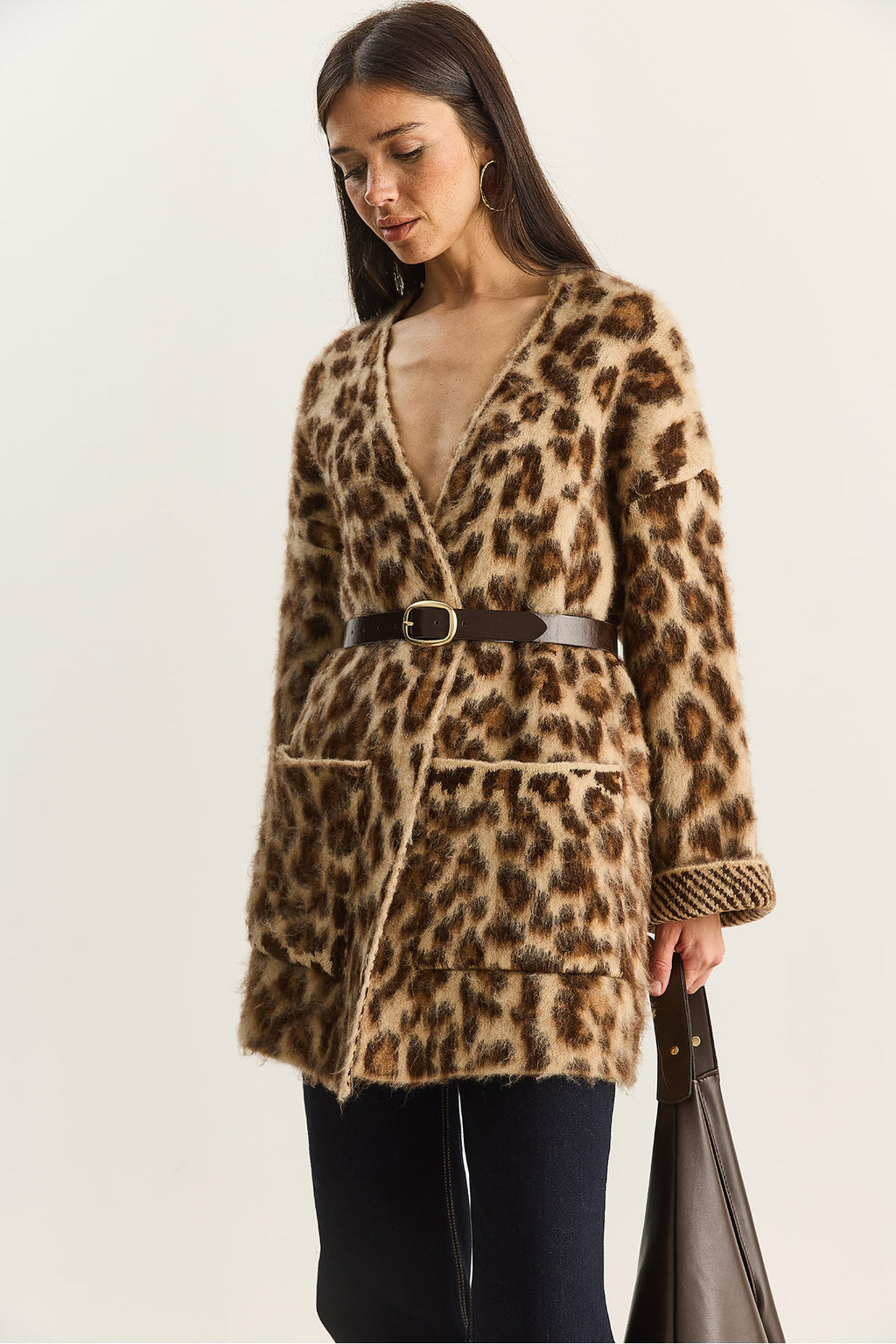 Women's Pocket Detailed Patterned Oversize Rose Gold Knitted Cardigan 20251101