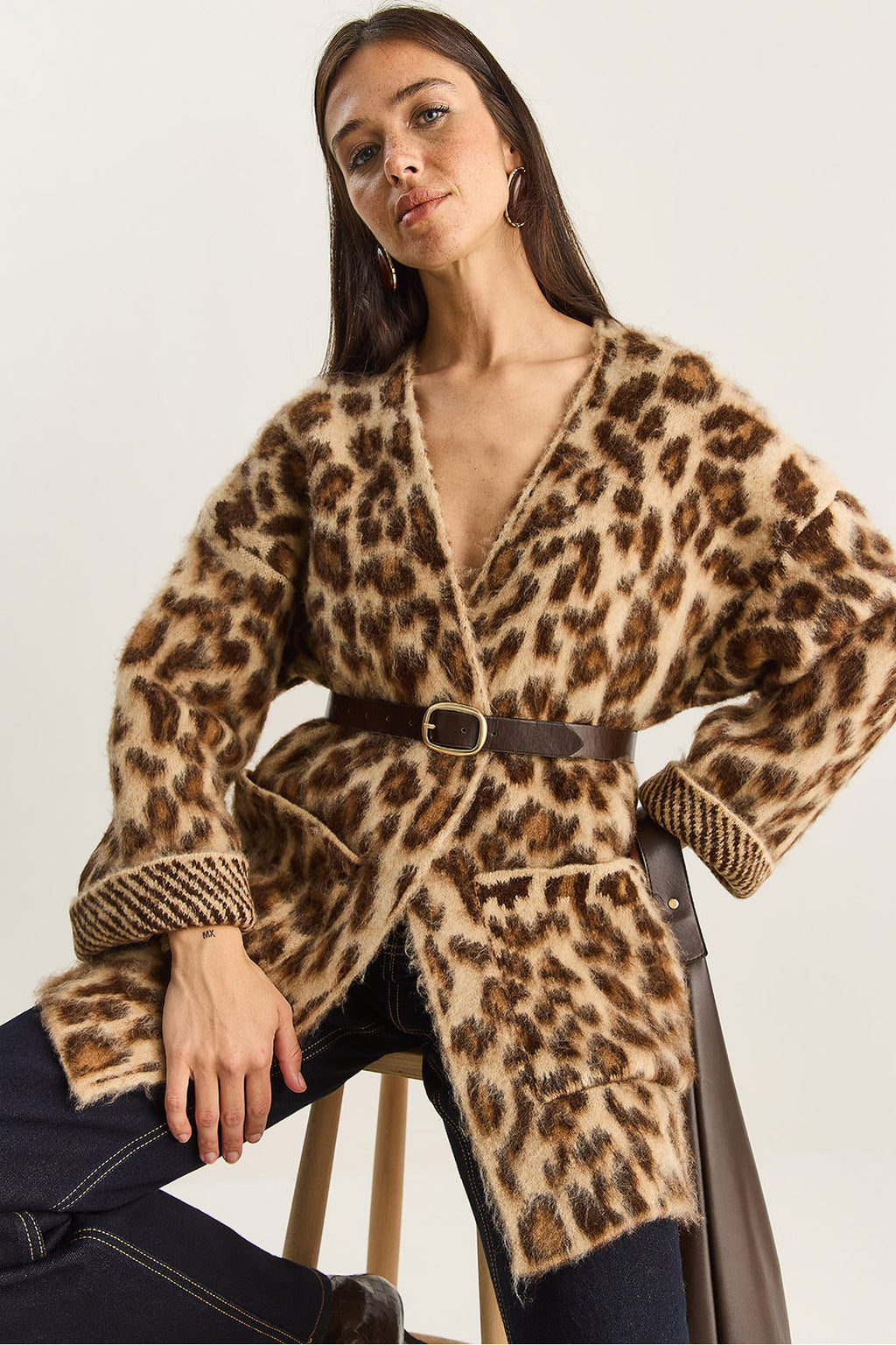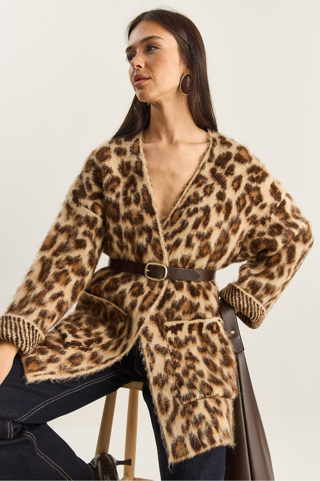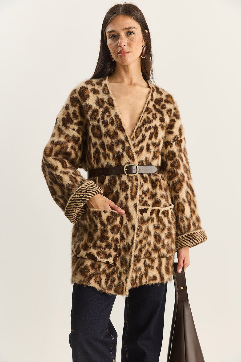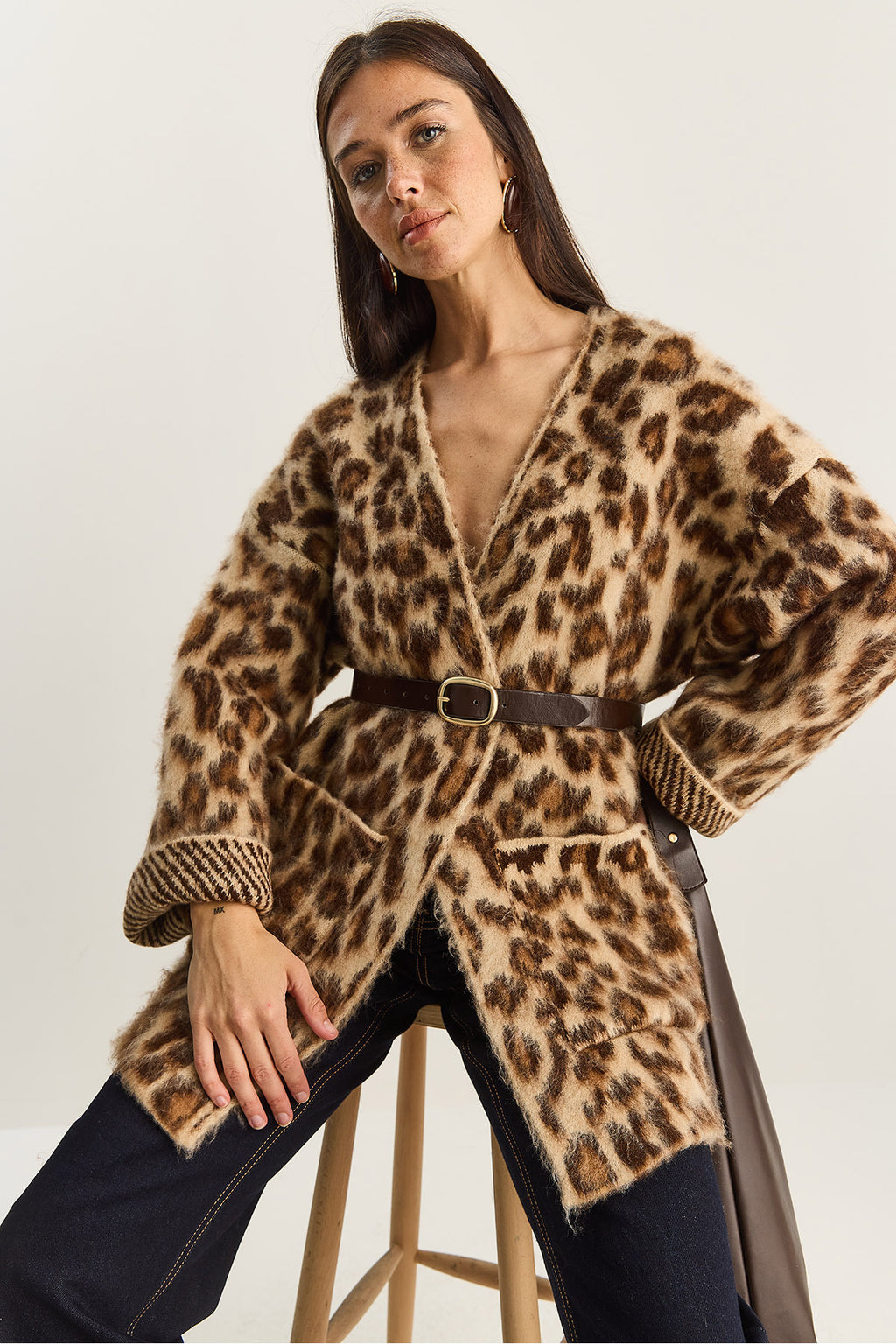 Women's Pocket Detailed Patterned Oversize Rose Gold Knitted Cardigan 20251101