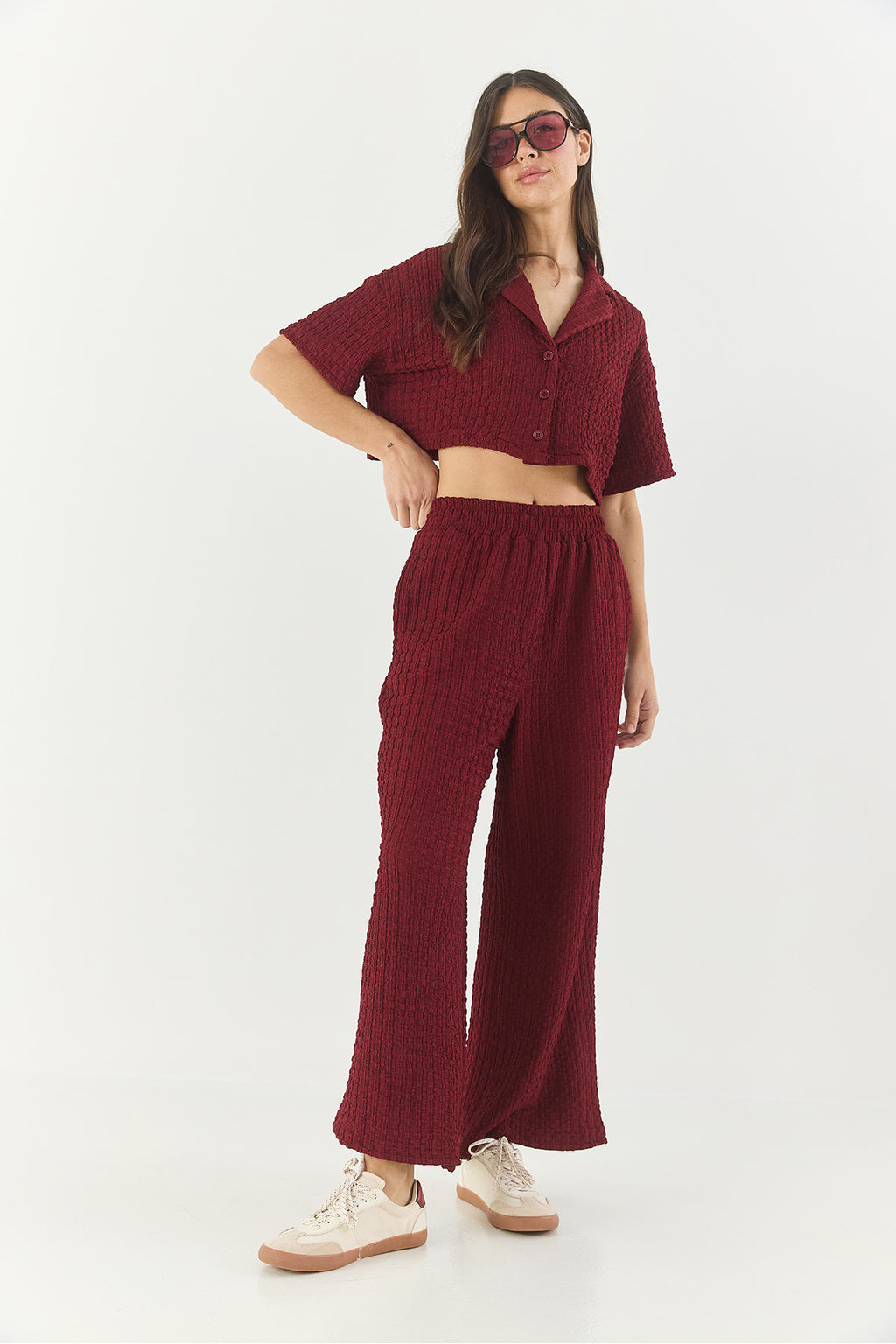 Women's Seersucker Crop Jacket Bottom-Top Set with Elastic Waist High Waist Trousers 9313 60281043
