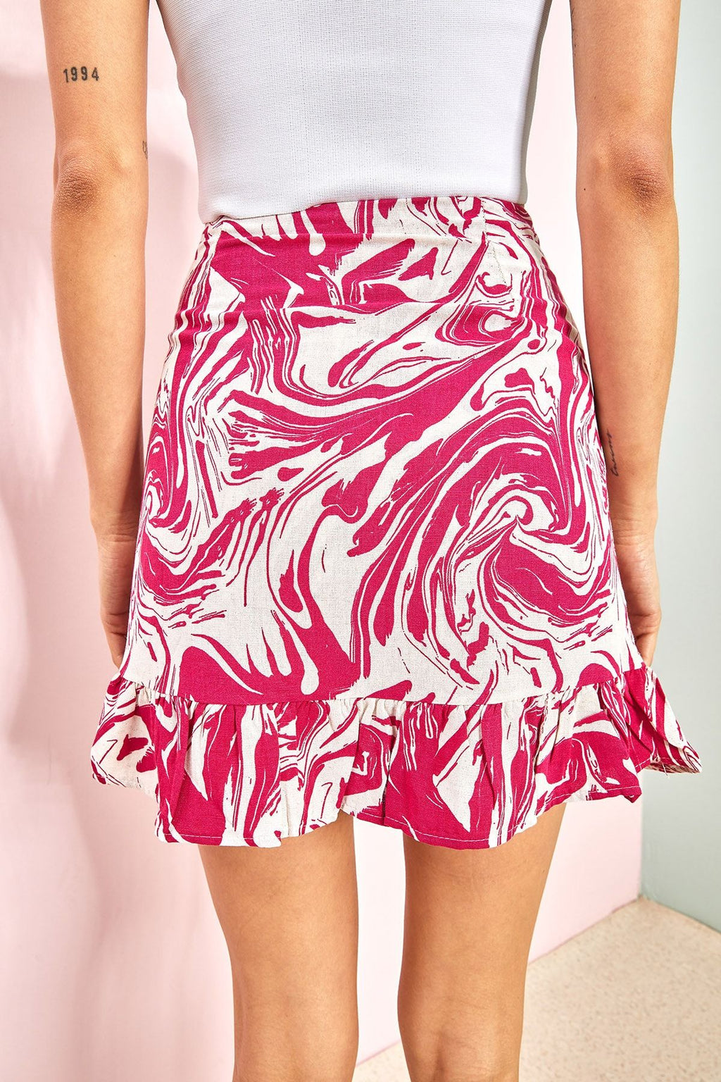 Women's skirt frilled buckle detailed patterned linen skirt 7079