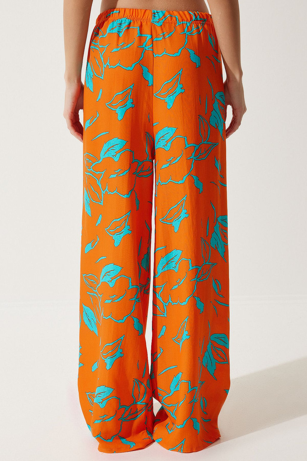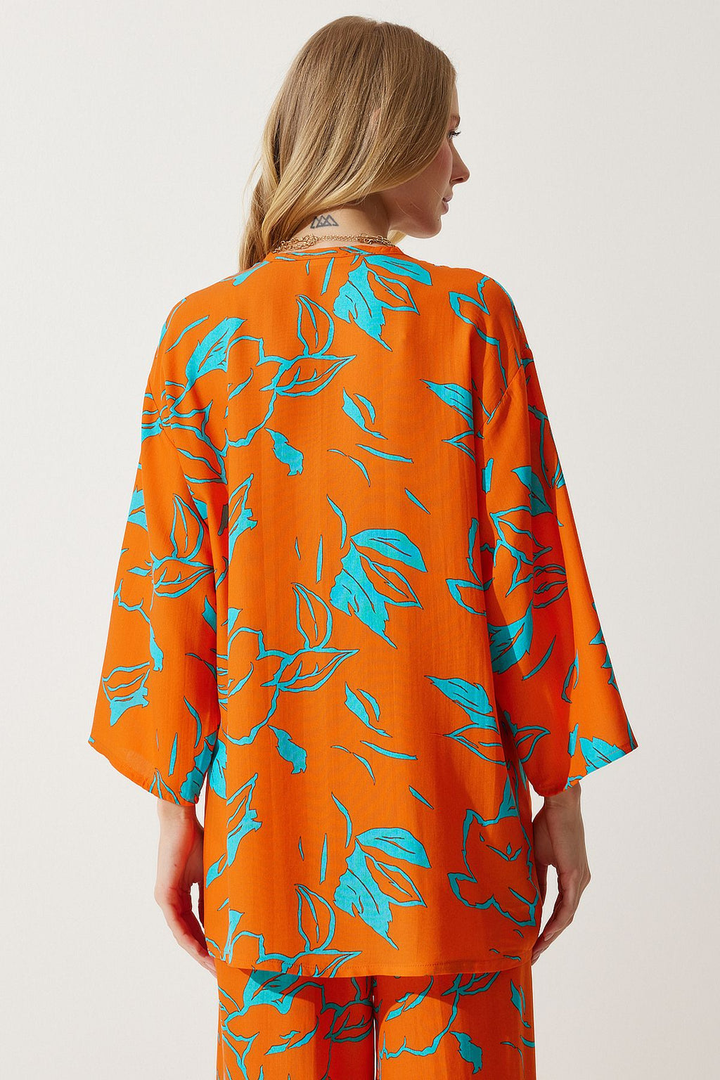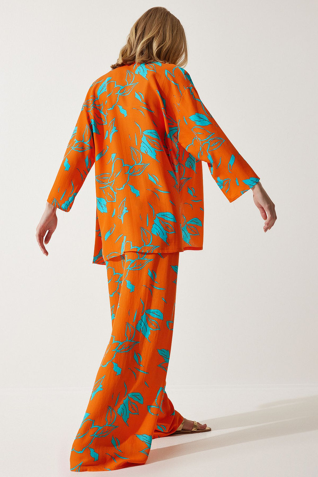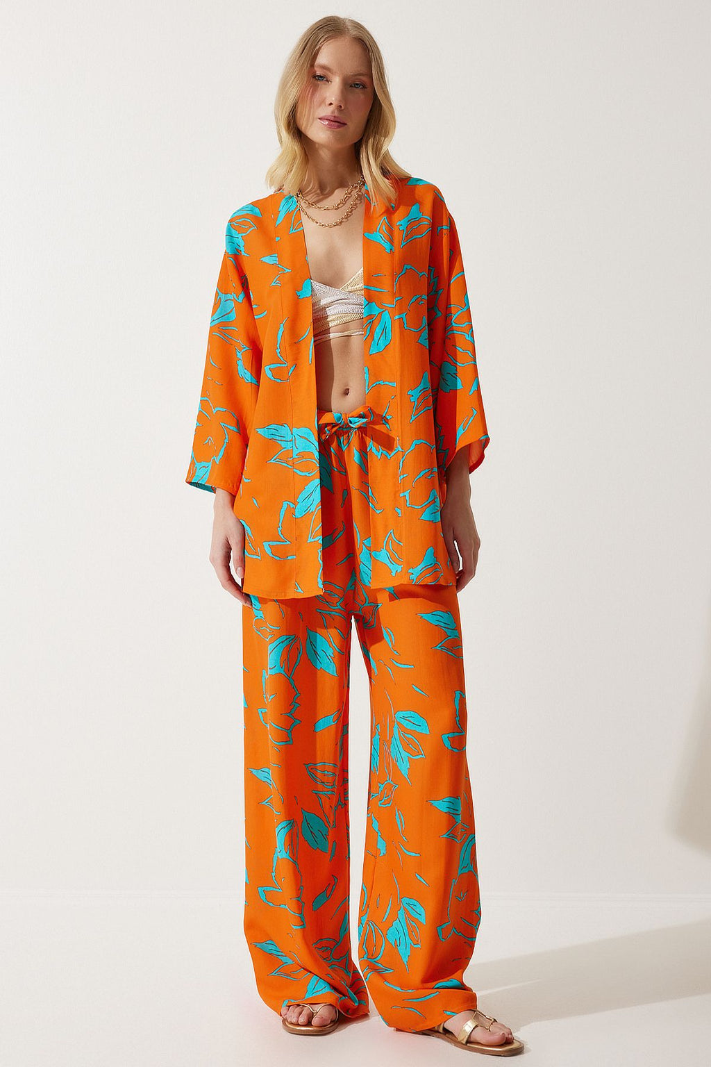 Women's Sky Blue Orange Patterned Kimono Palazzo Pants Set EN00614