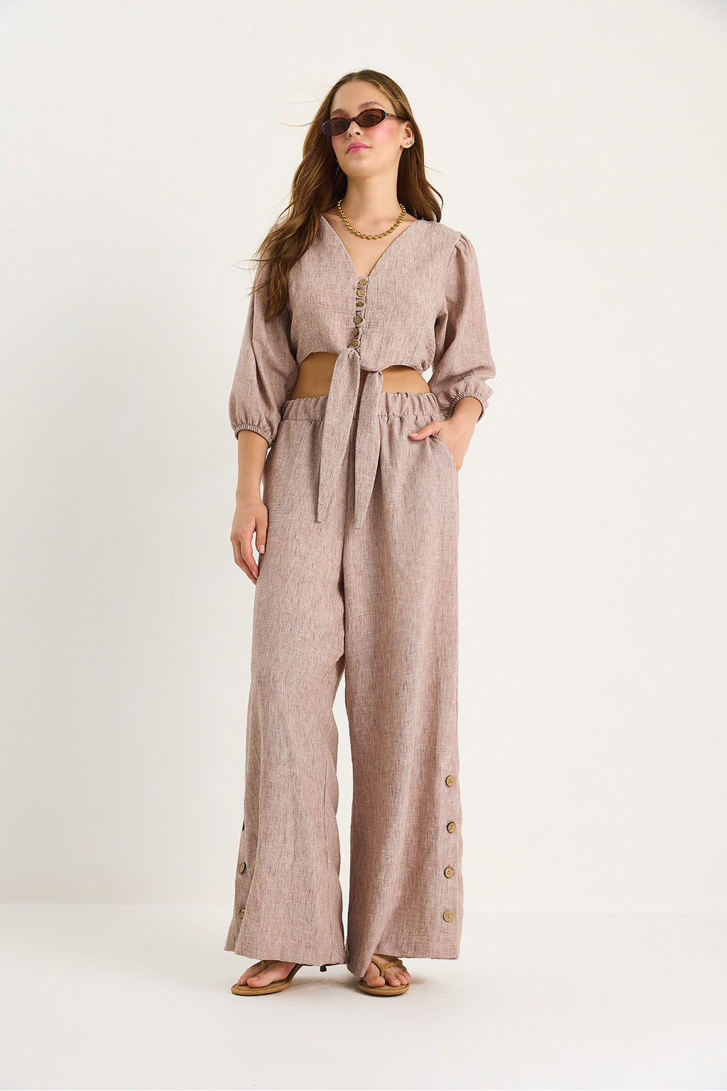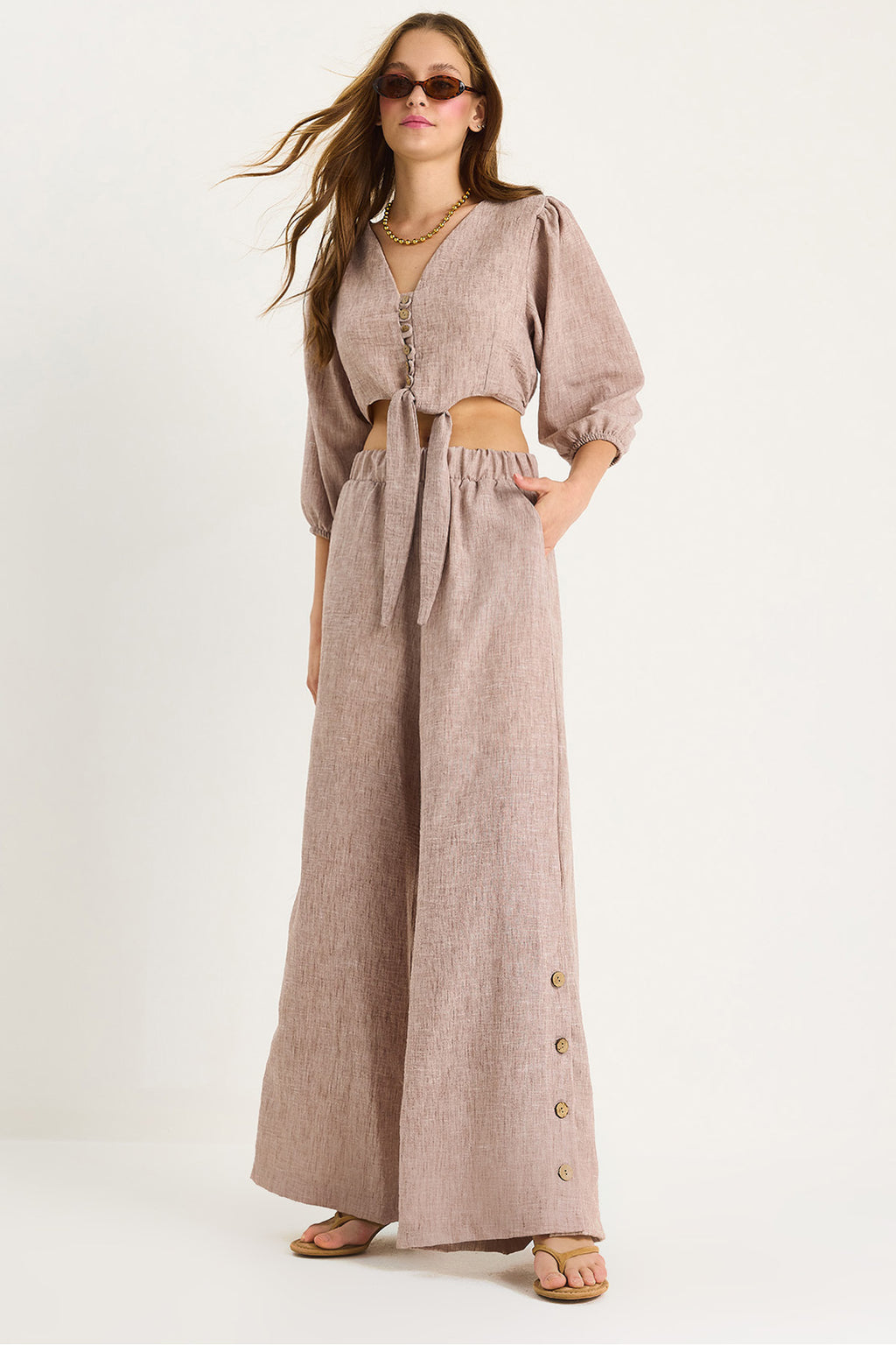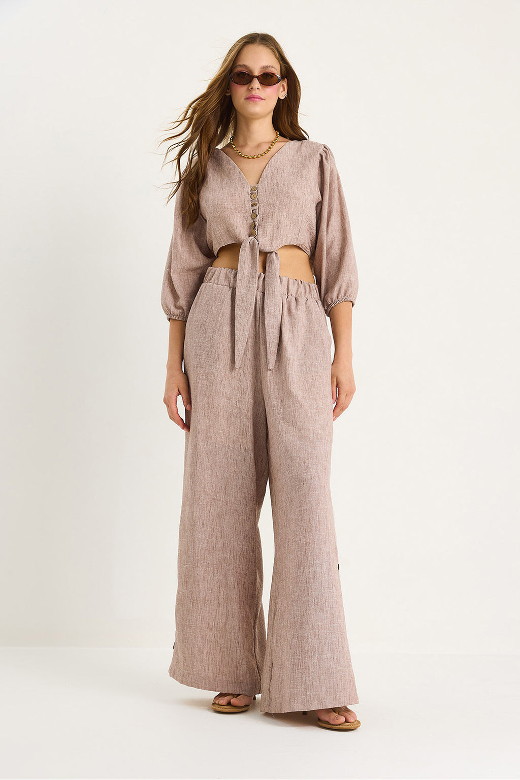 Women's Tie Detailed Blouse Lined Bottom-Top Suit with Button-Cuffed Trousers 9266 60281046