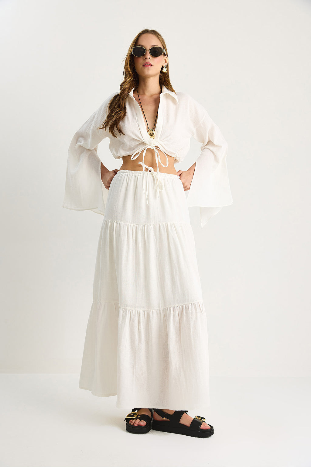 Women's Tie Detailed Slit Wide Sleeve Blouse Lined Long Skirt Suit DT251007 60283497