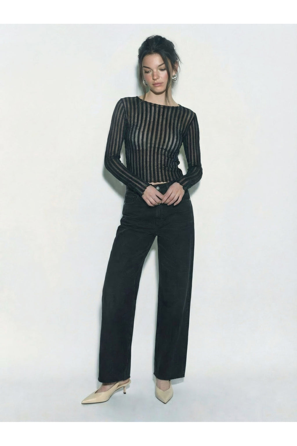 Women's Transparent Stripe Patterned Long Sleeve Tulle Blouse 6026 60283936