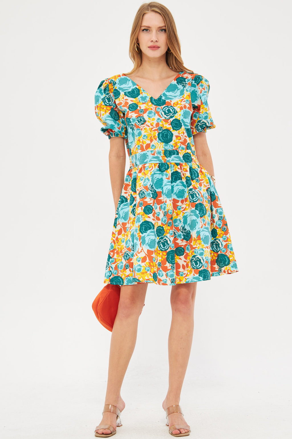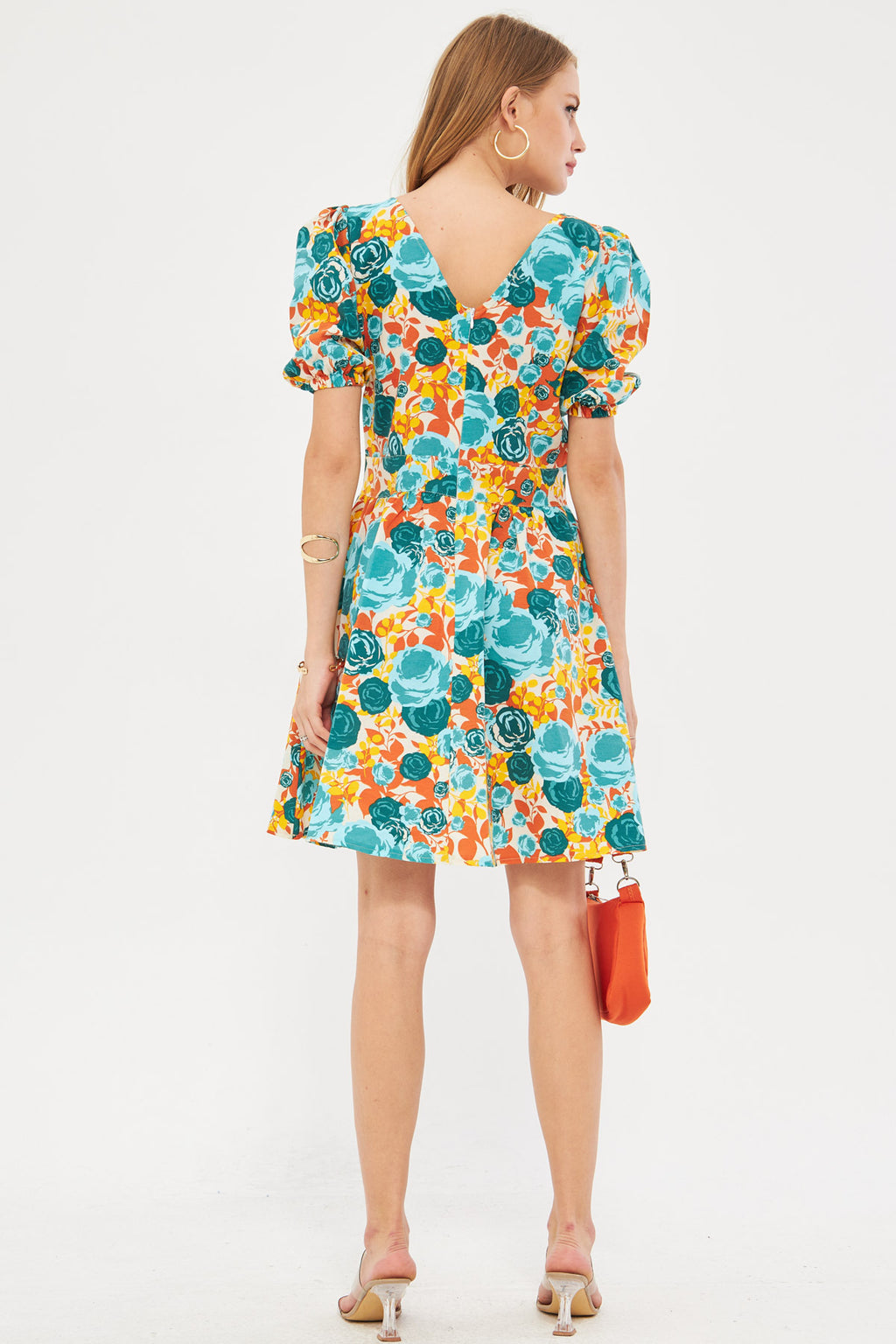 Women's Turquoise Front Back V-Neck Balloon Sleeve Belt Detailed Patterned Mini Dress ARM-24Y001016