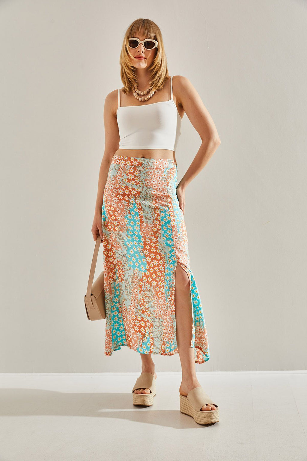 Women's turquoise-orange side hidden zipper slitted floral skirt 60251034
