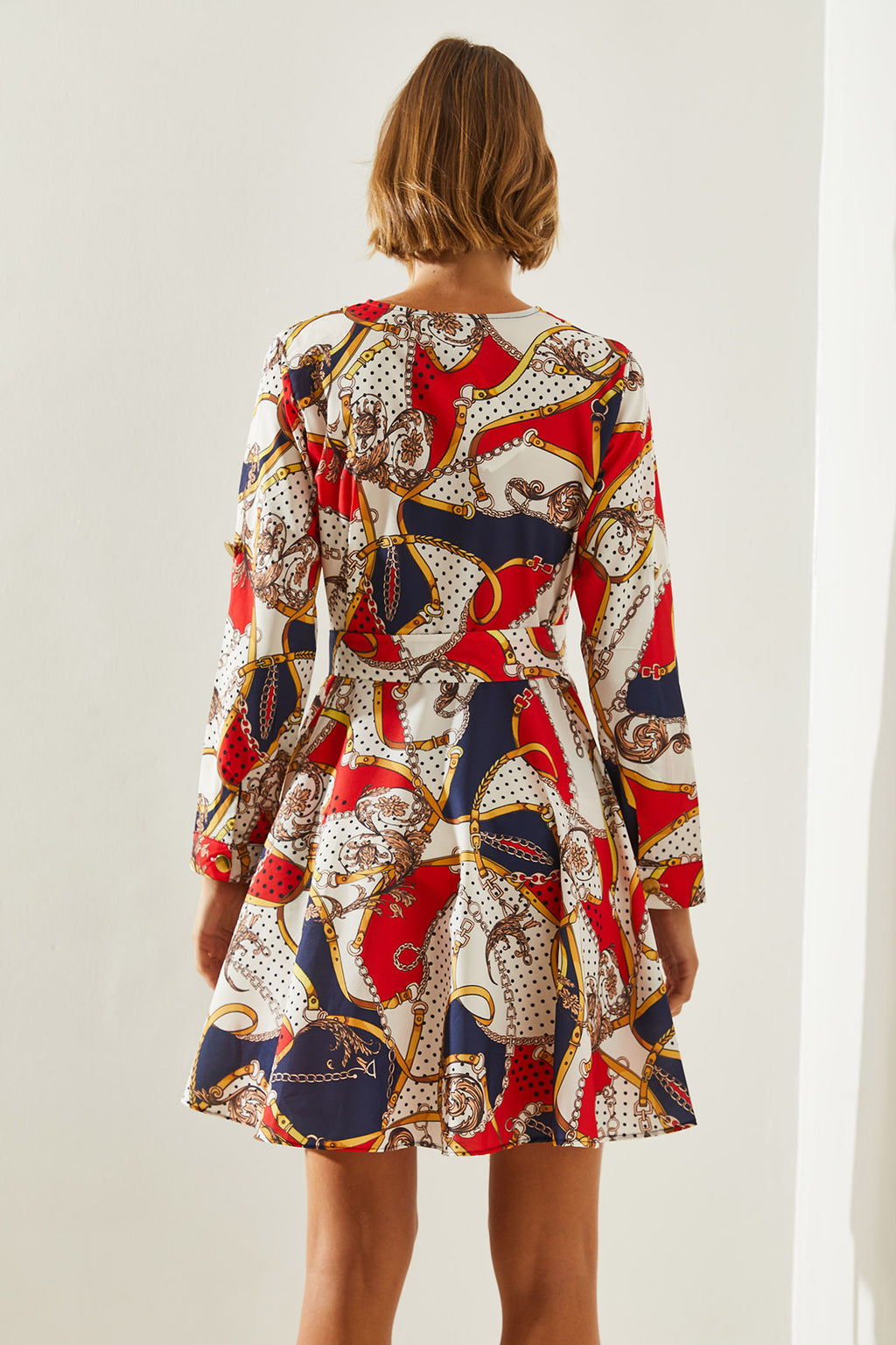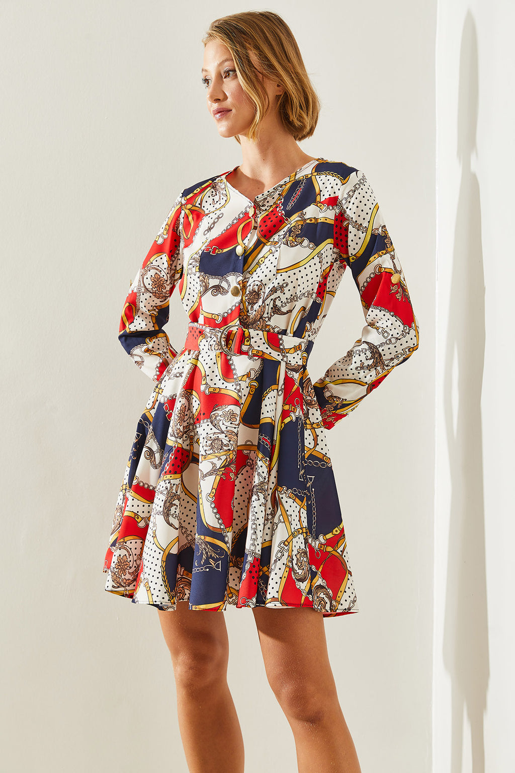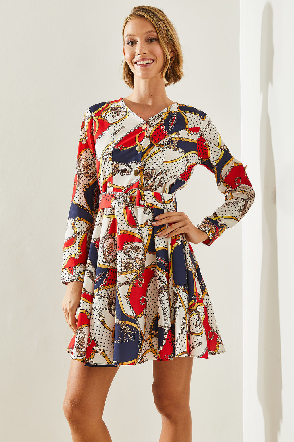Women's V-Neck Button Detailed Chain Patterned Belted Dress 22127 60251609