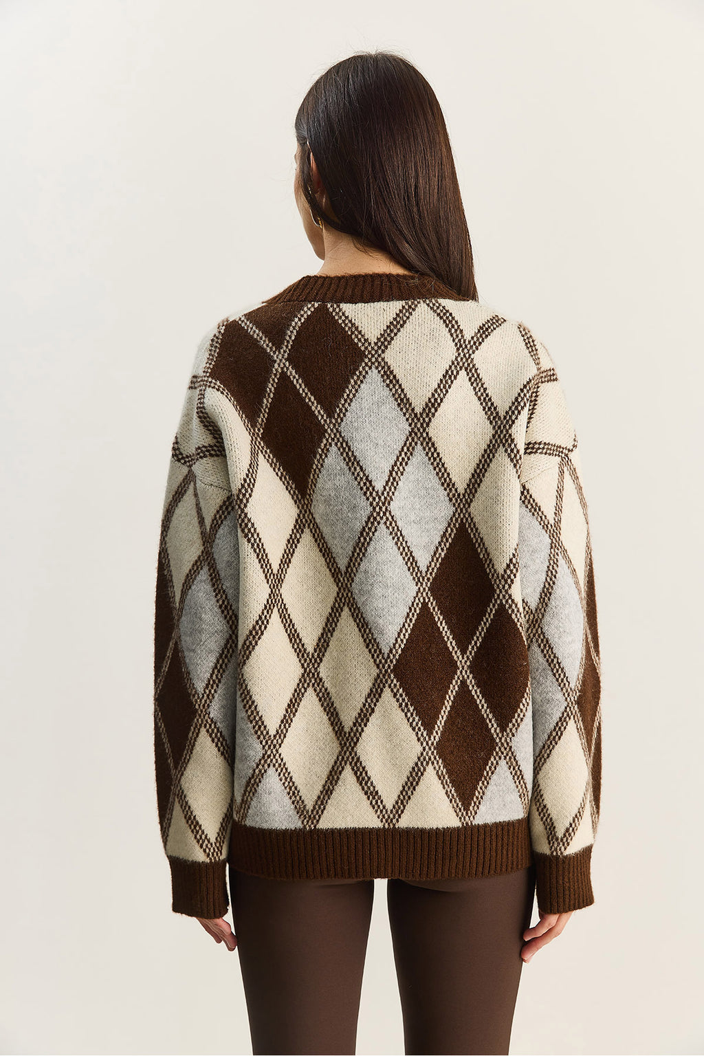 Women's V-Neck Buttoned Diamond Patterned Cardigan 20258052