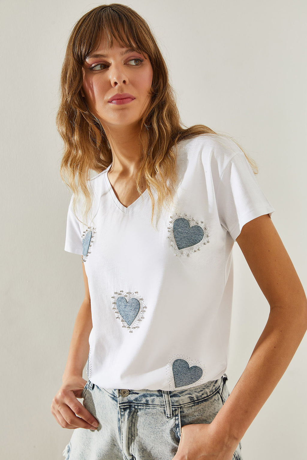 Women's V-Neck Collar Denim Heart Detailed Stone T-Shirt 60251412