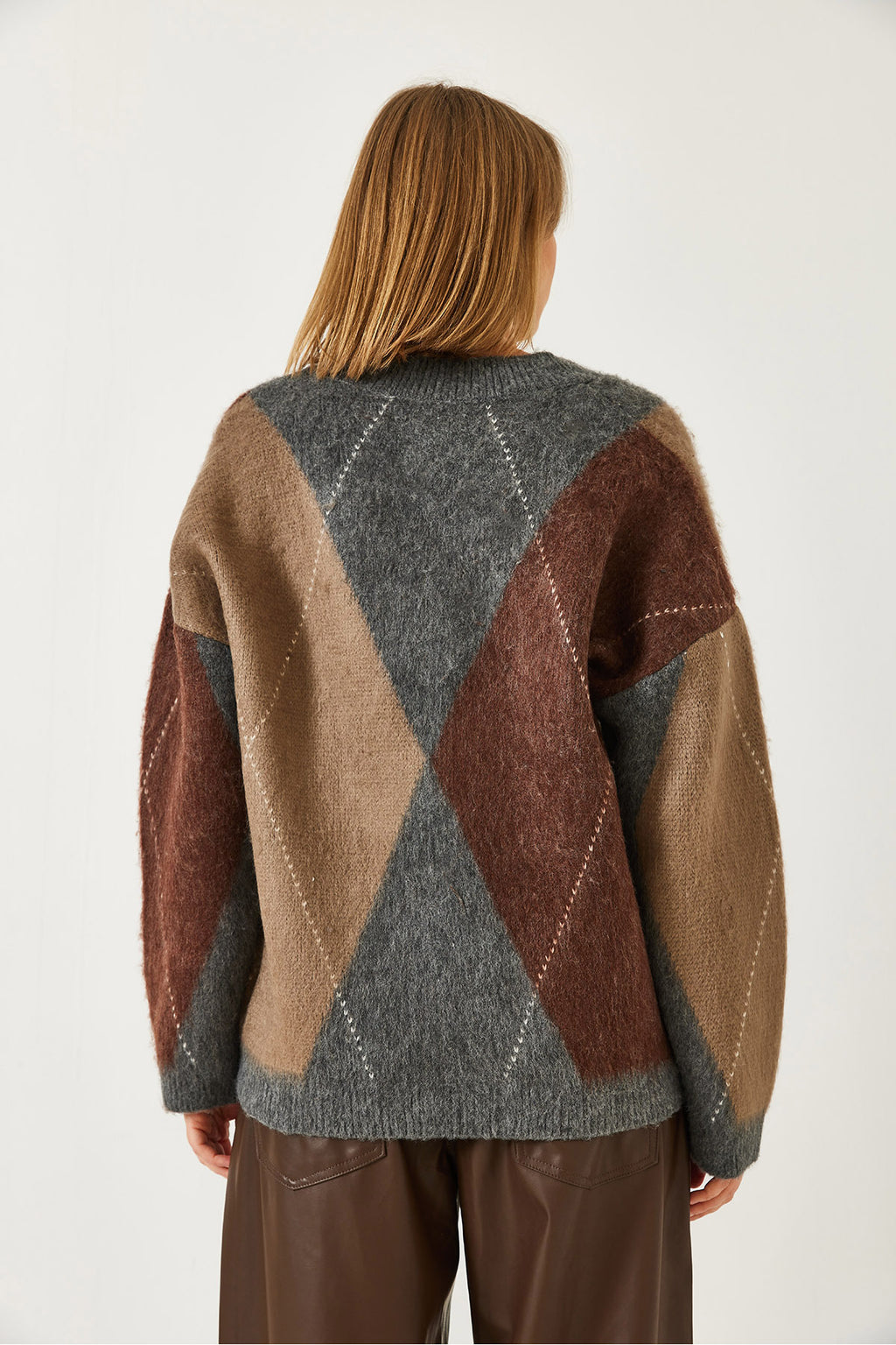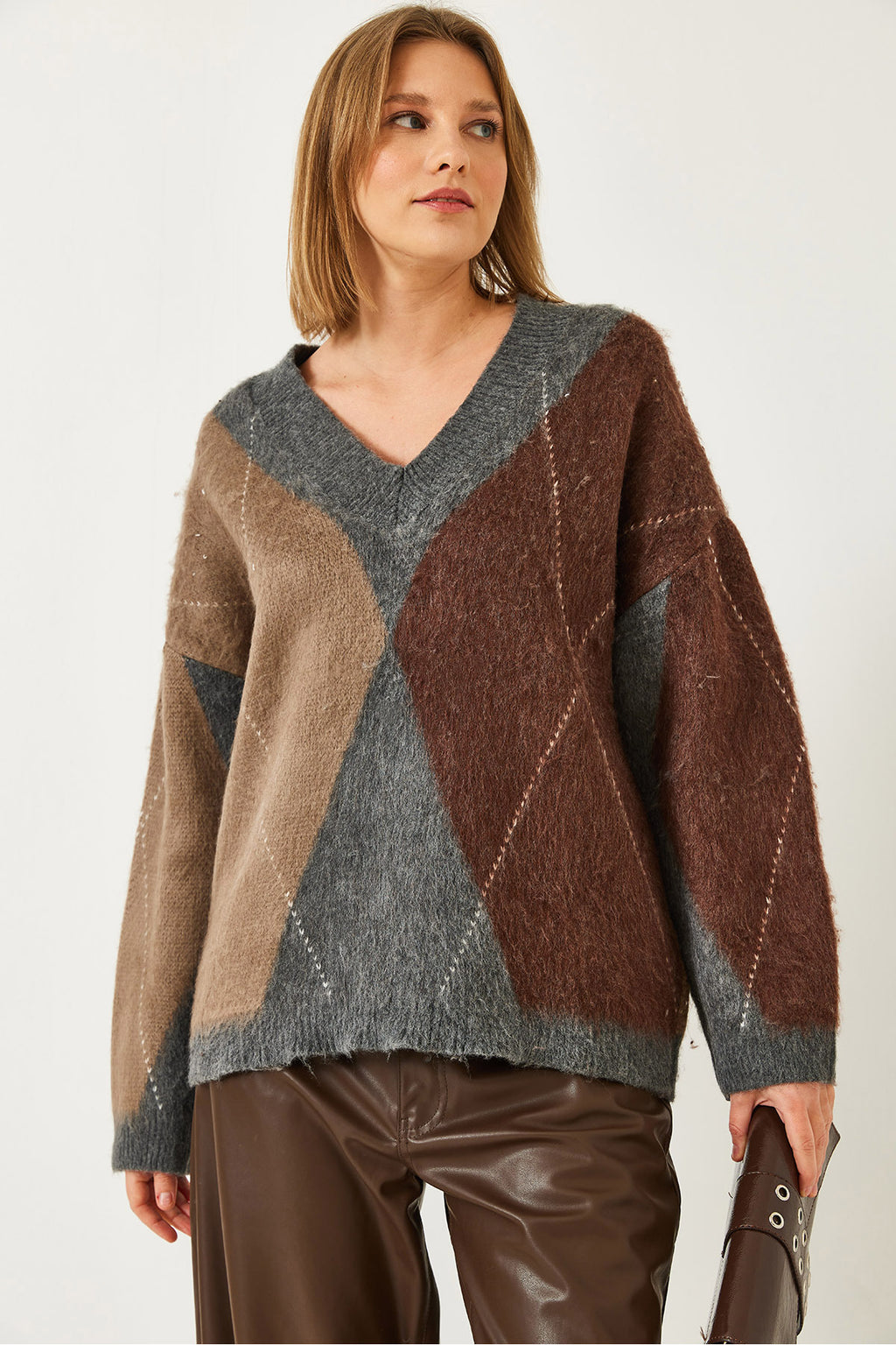 Women's V-neck Diamond Patterned Knitwear Sweater 241222 60261232