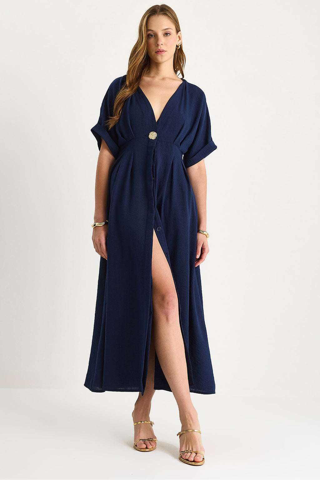 Women's V-Neck Gold Button Detailed Linen Dress 5266 60281107