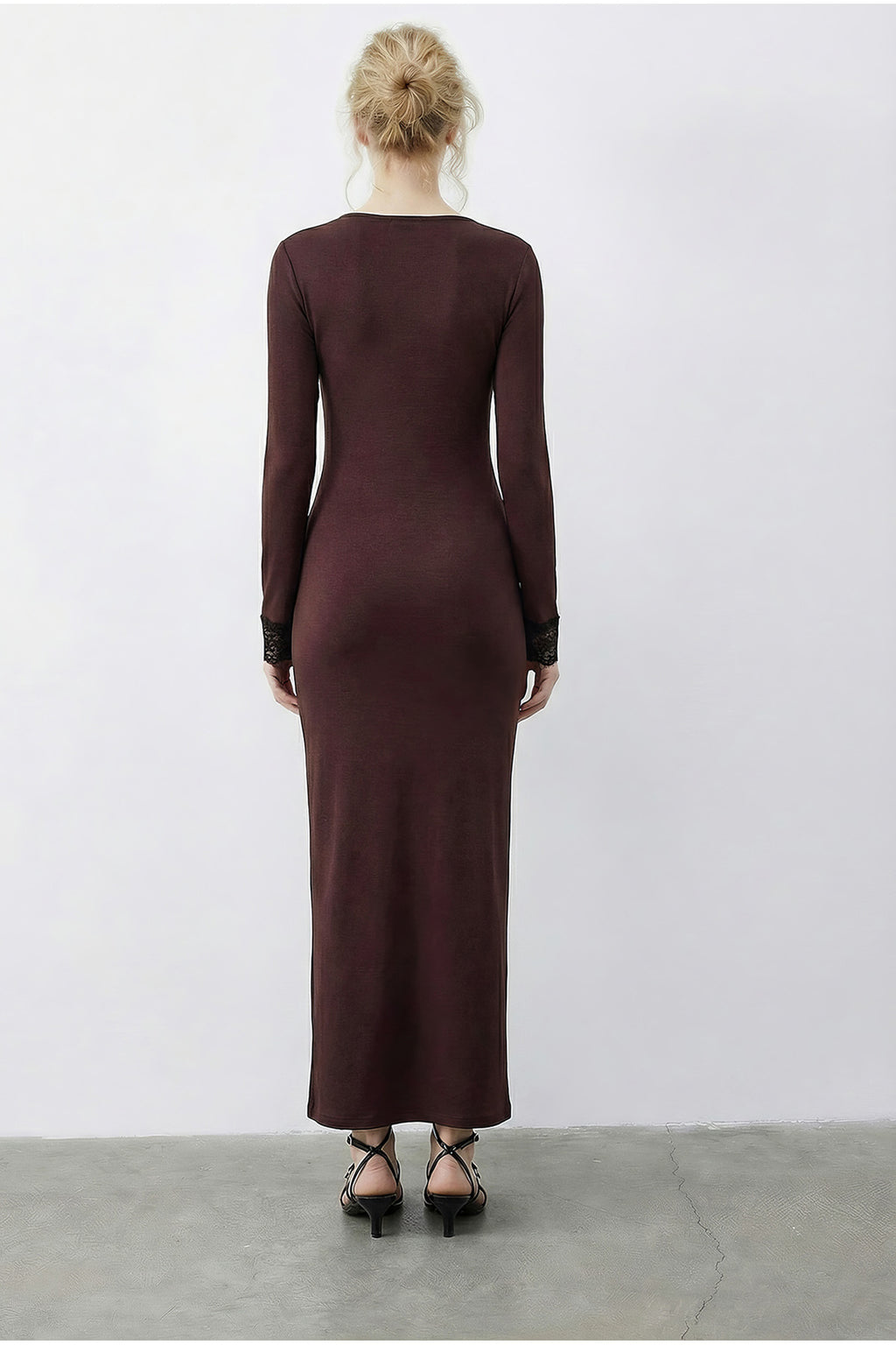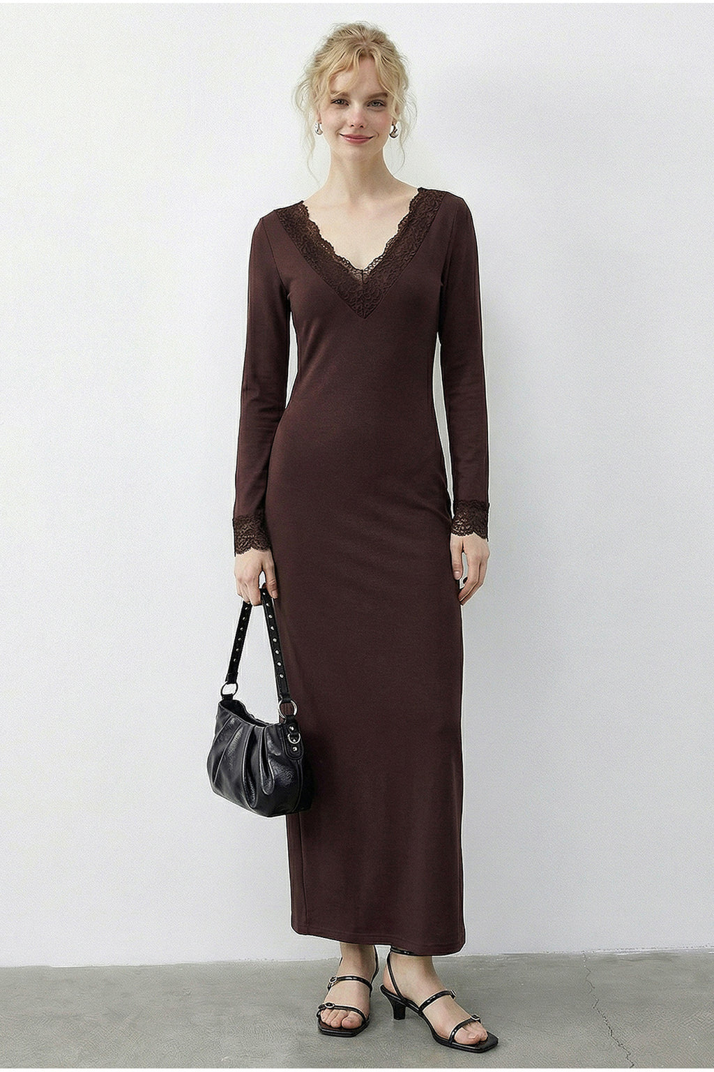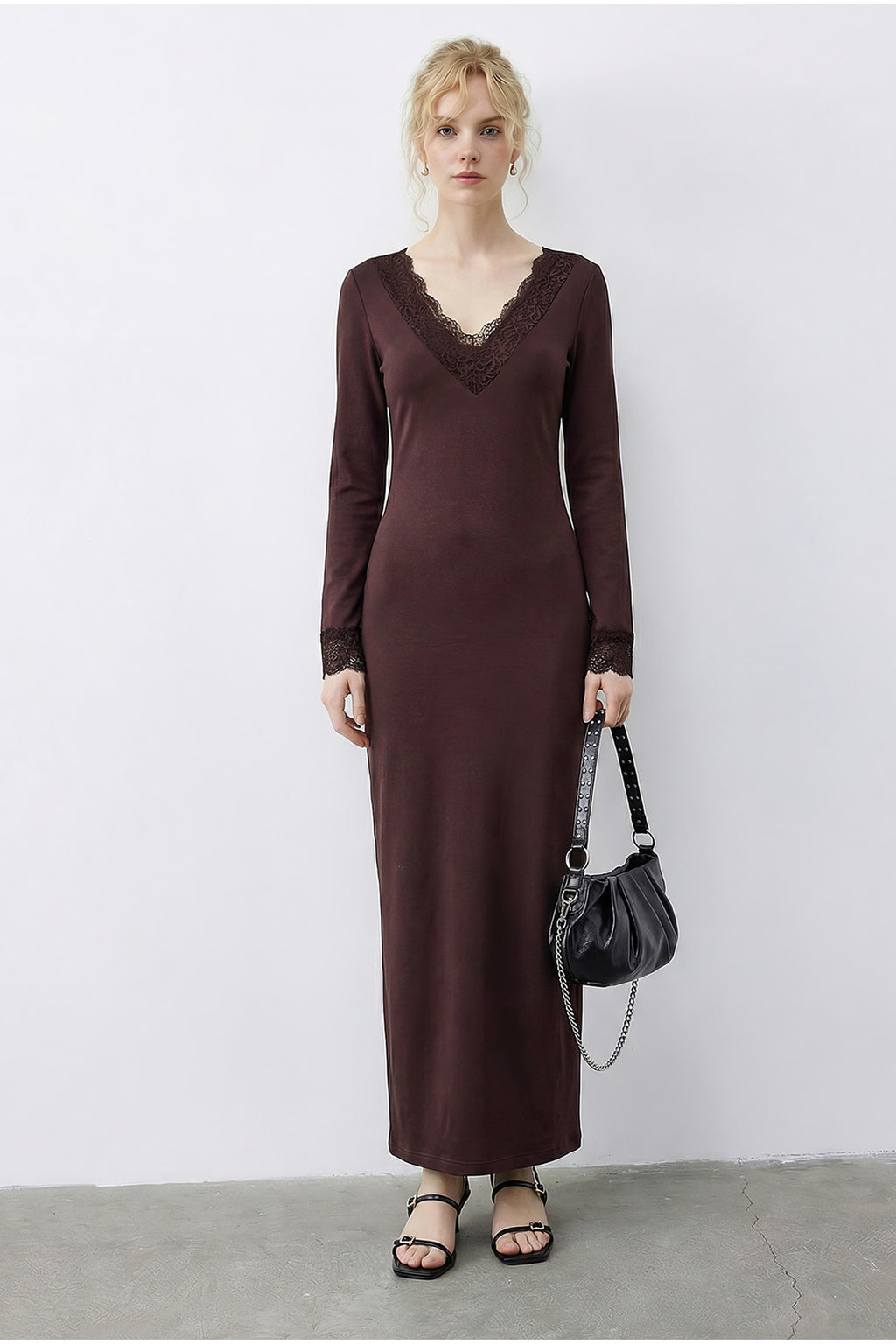 Women's V-Neck Lace Detailed Lycra Long Pencil Dress 4104 60283963