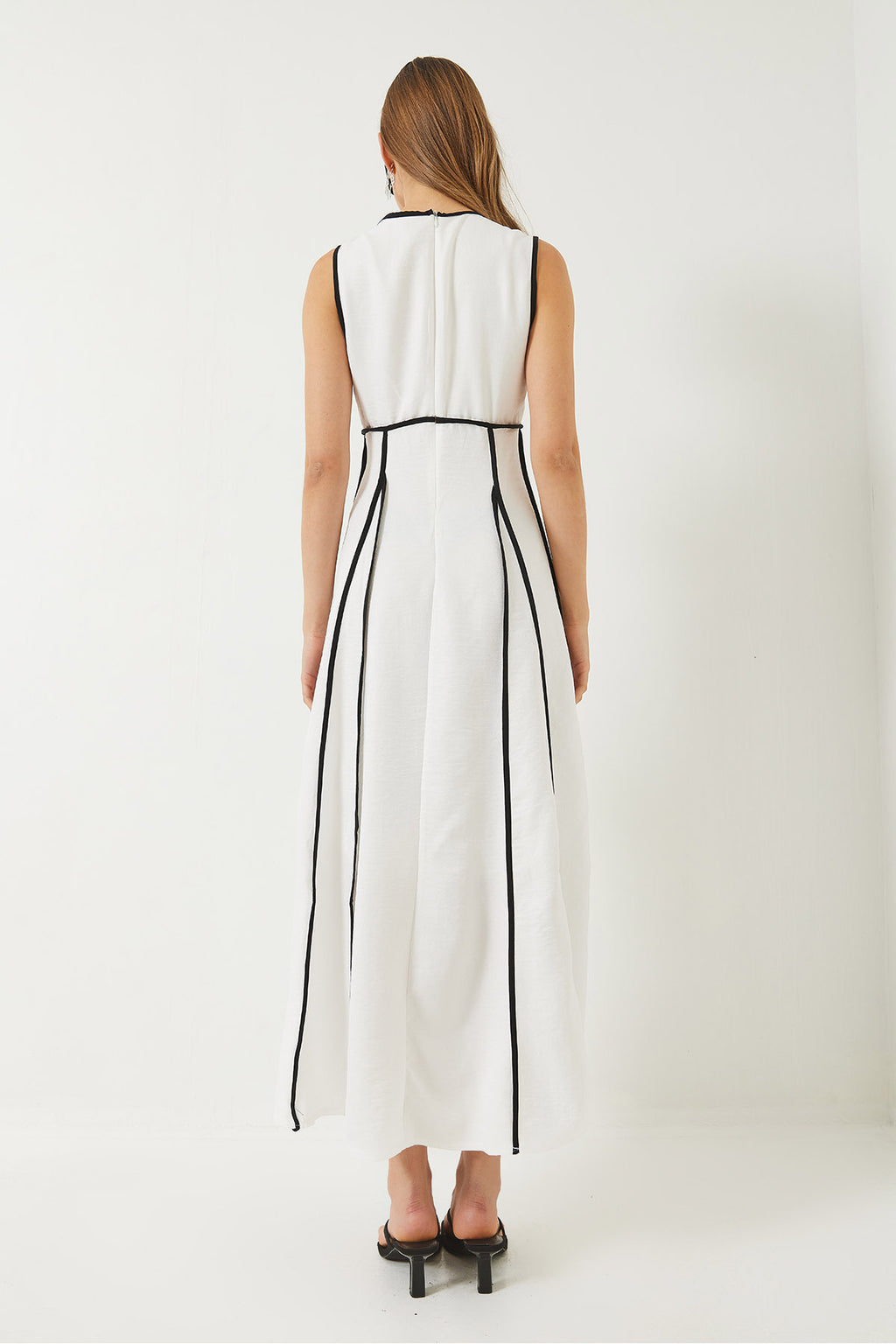 Women's V-Neck Piping Detailed Tie-Up Lined Long Linen Dress 60283097