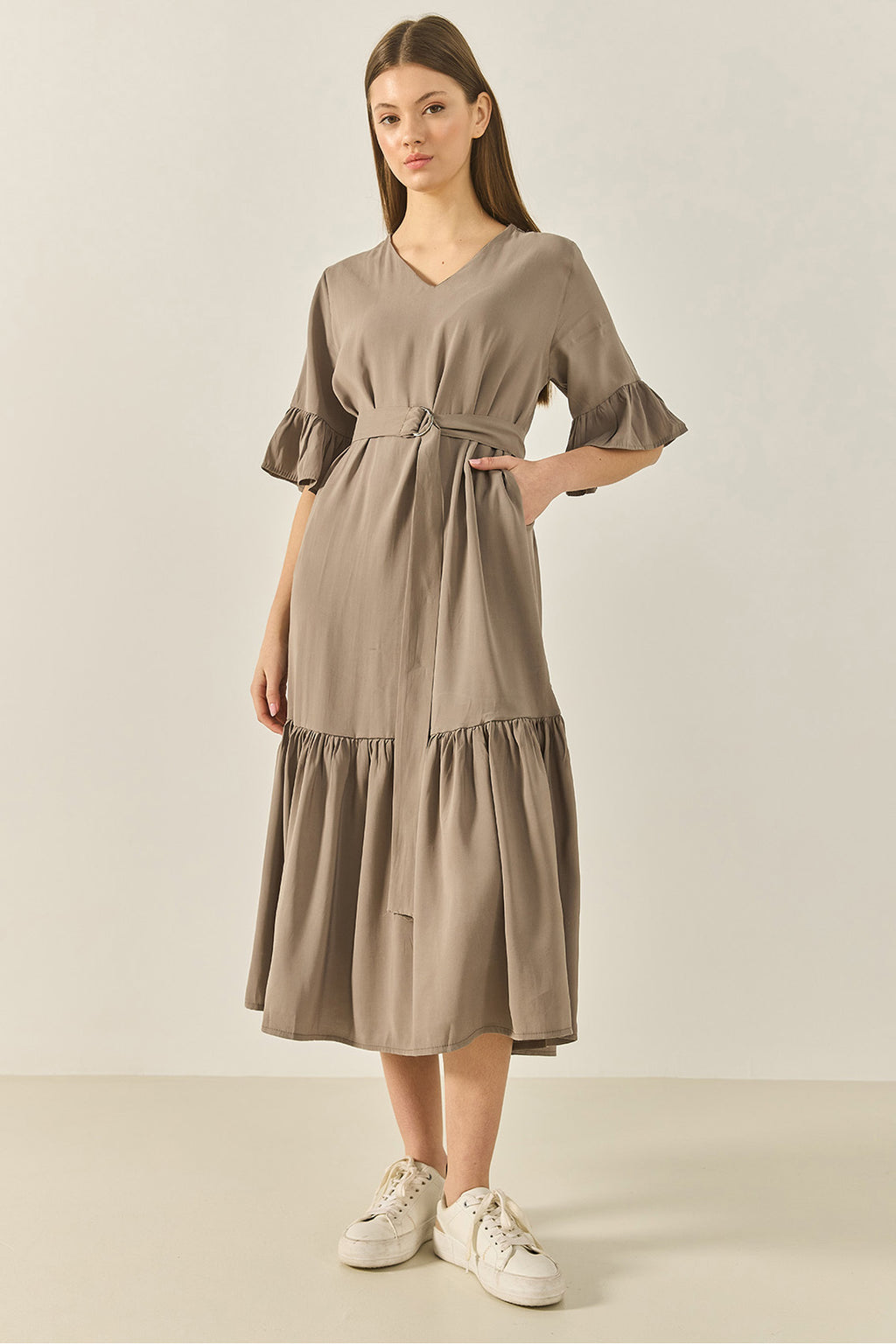 Women's V-Neck Pocket Belted Skirt Flounce Detailed Casual Dress 8406 60283256