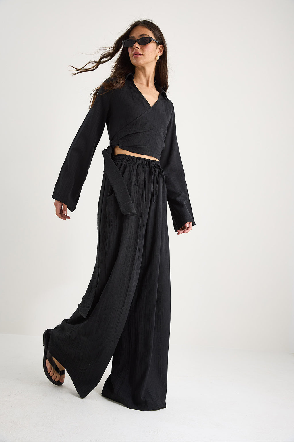 Women's V-Neck Tie Detailed Blouse with Pocket Detail and Loose Trousers Suit with Elastic Waist 60283324