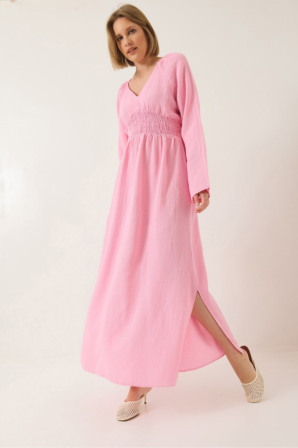 Women's V-neck Waist Gimped Wide Sleeve Slit Detailed Long Cotton Muslin Dress 3016 60283196
