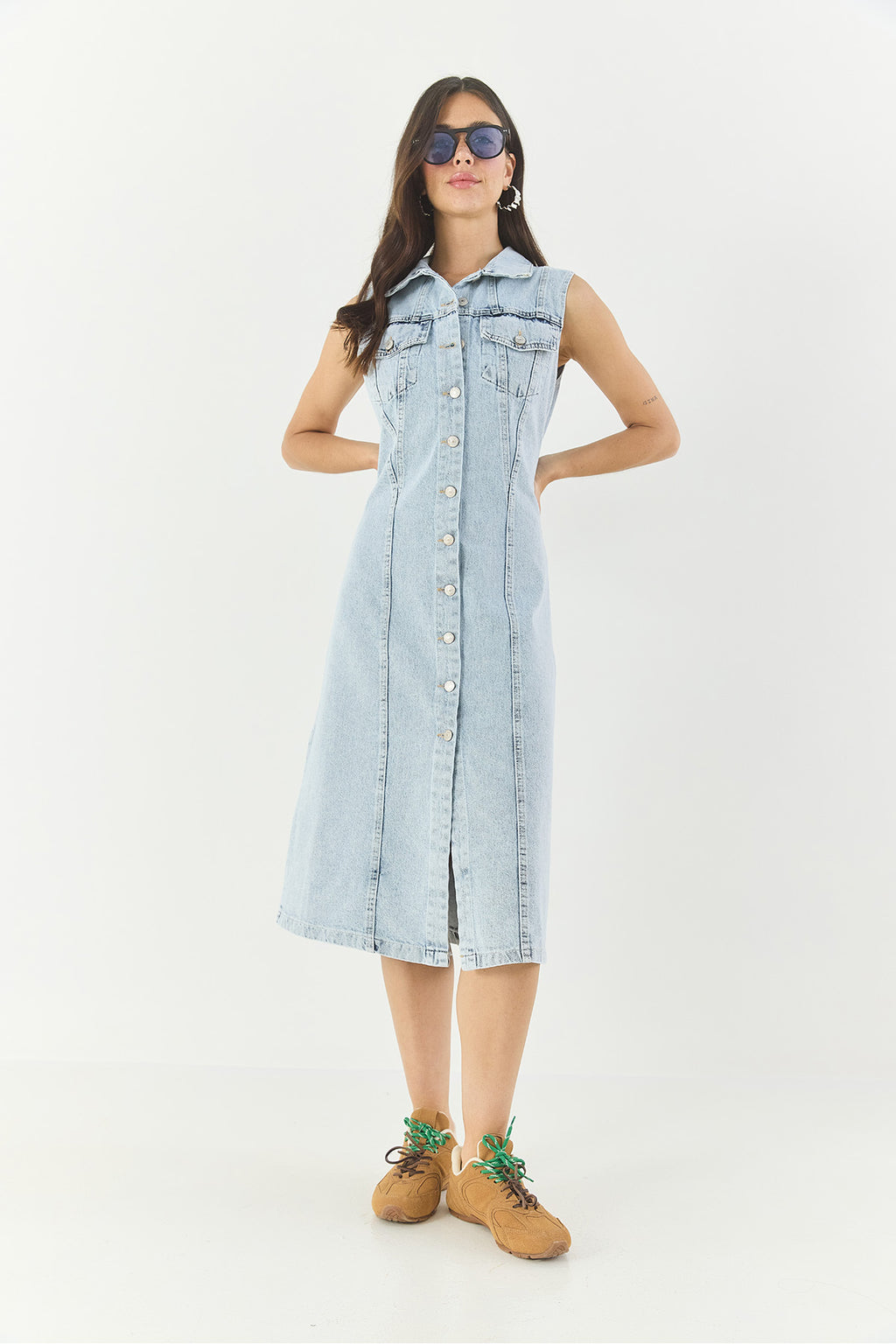 Women's Waist-Fitting, Covered Pockets, Zero Sleeves, Buttoned Denim Dress 3575 60283288