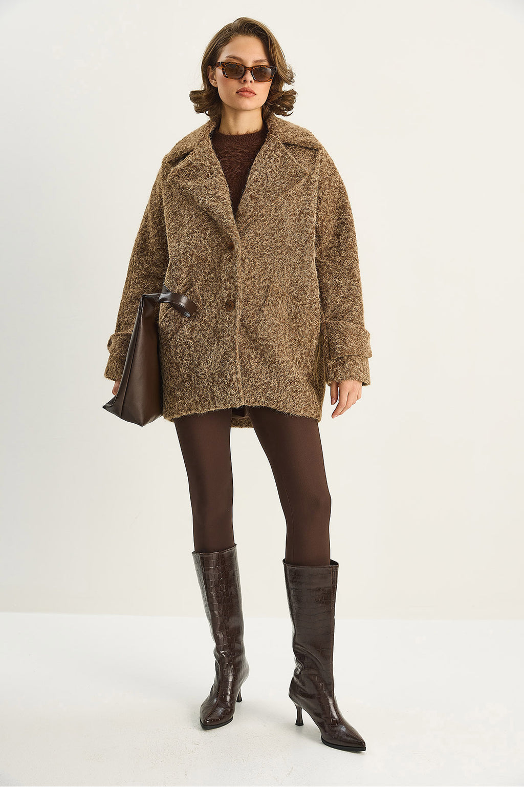 Women's Wide Collar Pocket Detailed Oversize Lined Boucle Cashew Coat 7033 60283735