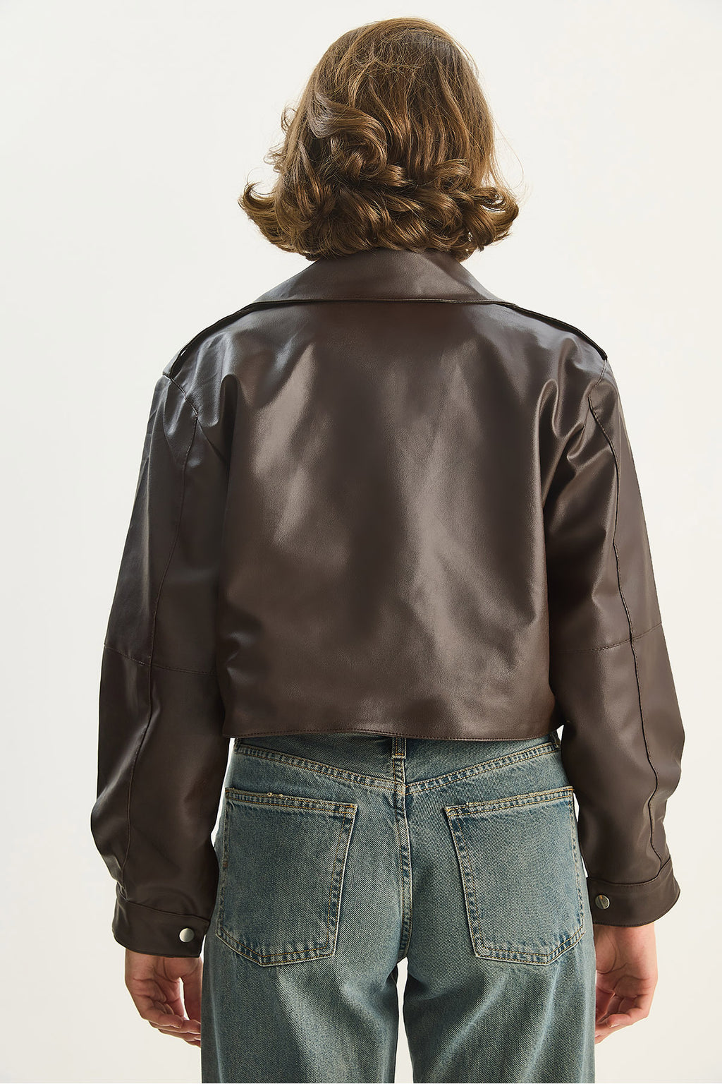Women's Wide Pocket Detailed Belted Oversize Crop Leather Jacket 3129 60284102