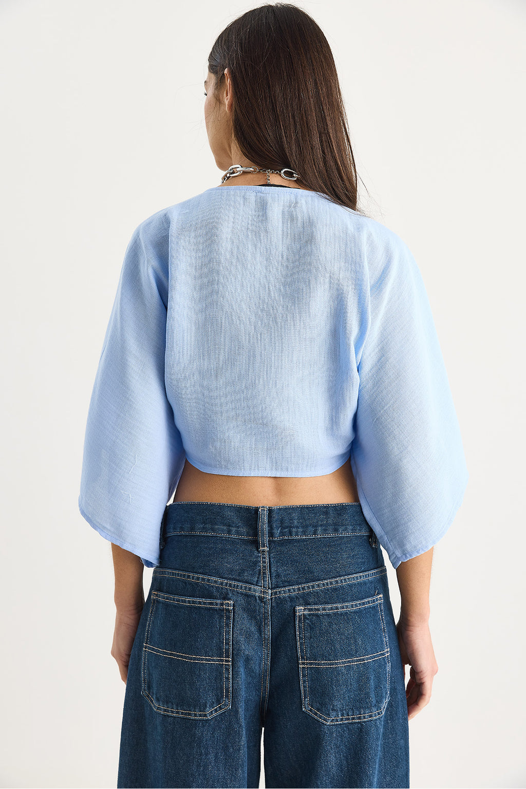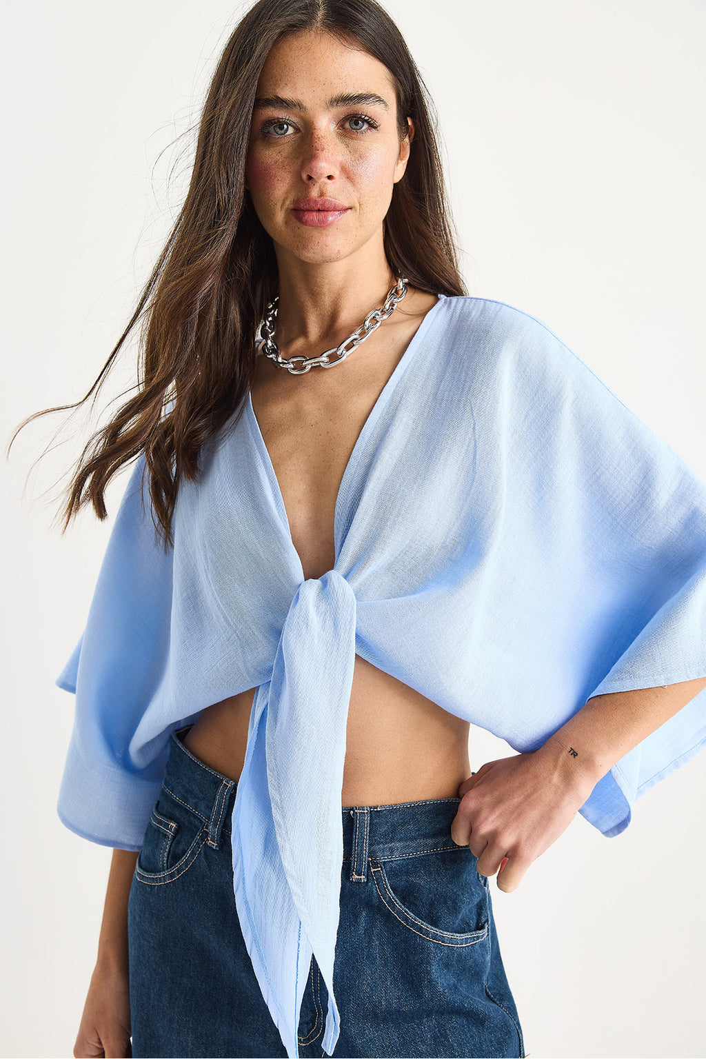 Women's Wide Sleeve V-Neck Tie Detailed Muslin Blouse 4729 60283396