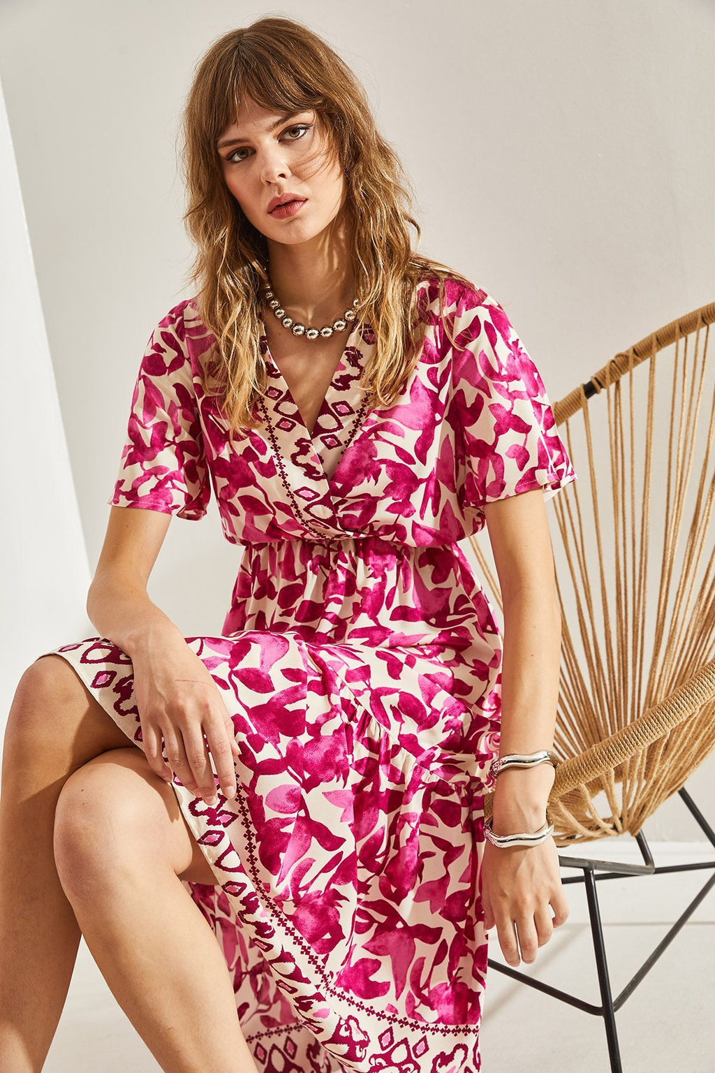 Women's Wrap Neck Waist Gathered Skirt Ruffle Detailed Dress 60251147