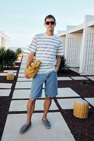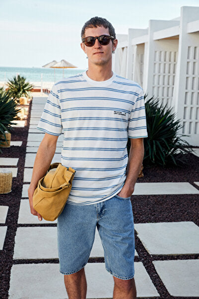 WOODY Men's 100% Cotton Embroidery Detailed Crew Neck Striped Regular Fit White-Blue Striped T-Shirt