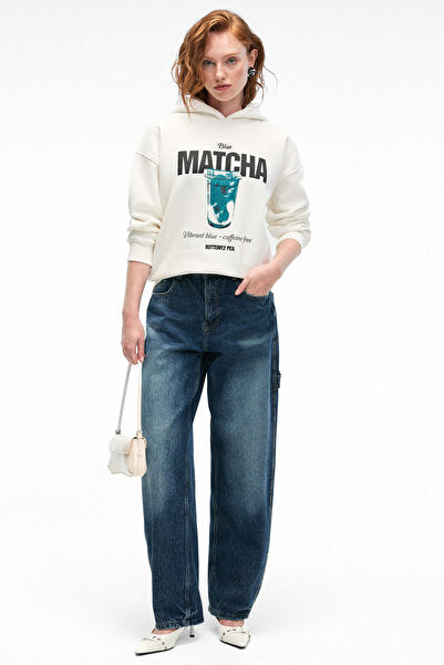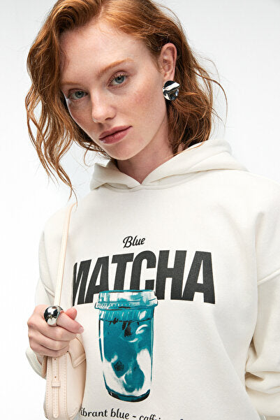 YANMESA Women's Oversize Print and Embroidery Detailed Long Sleeve Hooded White Sweatshirt