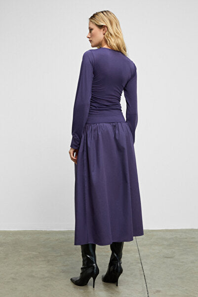 YOKEND Women's V-Neck Puff Detailed Flexible Fabric Skirt Poplin Purple Dress